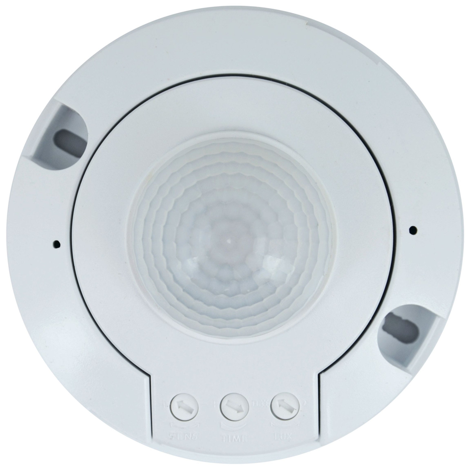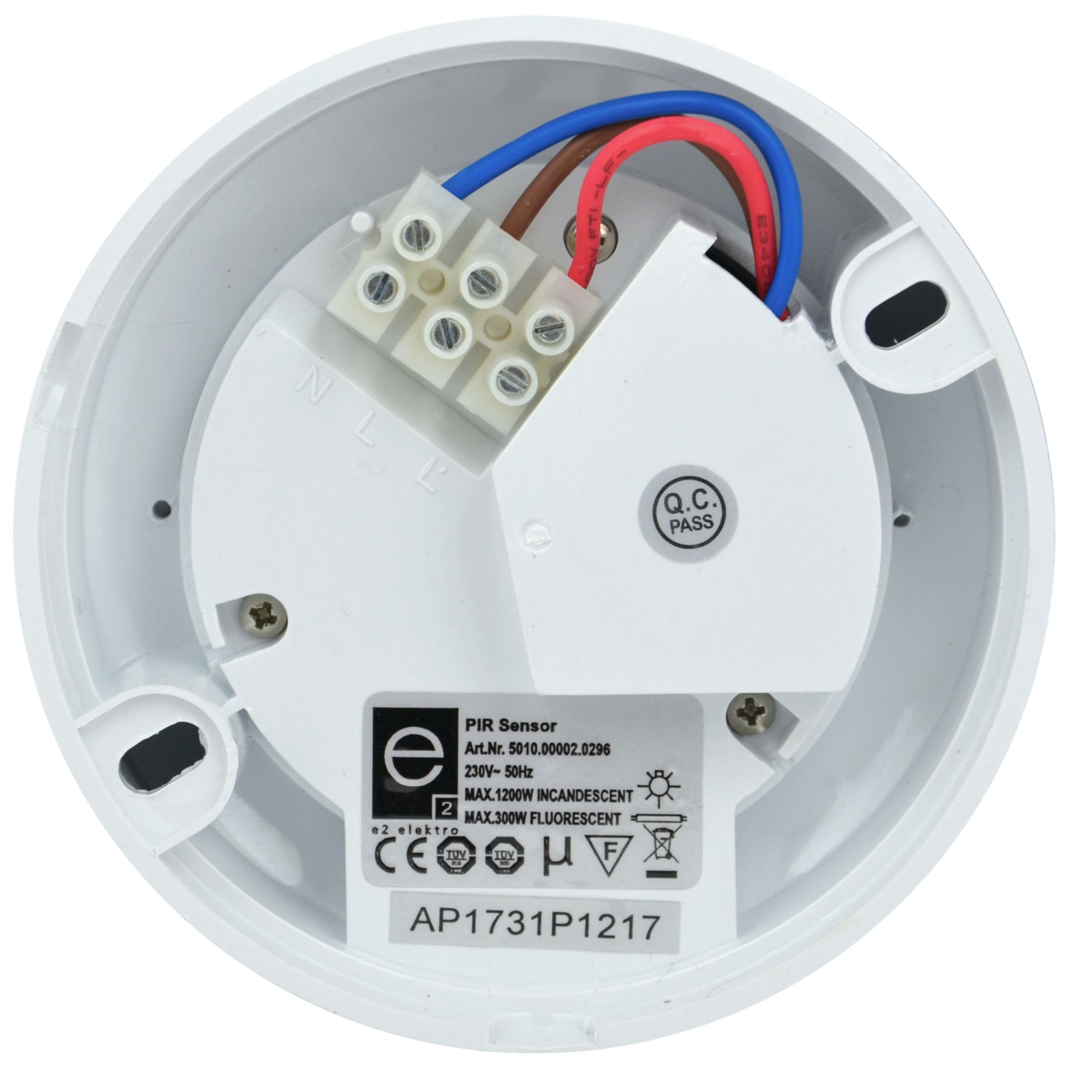 Aufputz Bewegungsmelder für Deckenmontage, Erfassungswinkel 360º, Reichweite: bis 12m Radius, Ausschaltverzögerung: 10 Sek. bis 12 Min. und Impuls, Dämmerungsschwelle stufenlos einstellbar (10-2000Lux), Schaltleistungen: 1200W ohmsche Last / 300W elektronische Last / 80W LED, IP20;