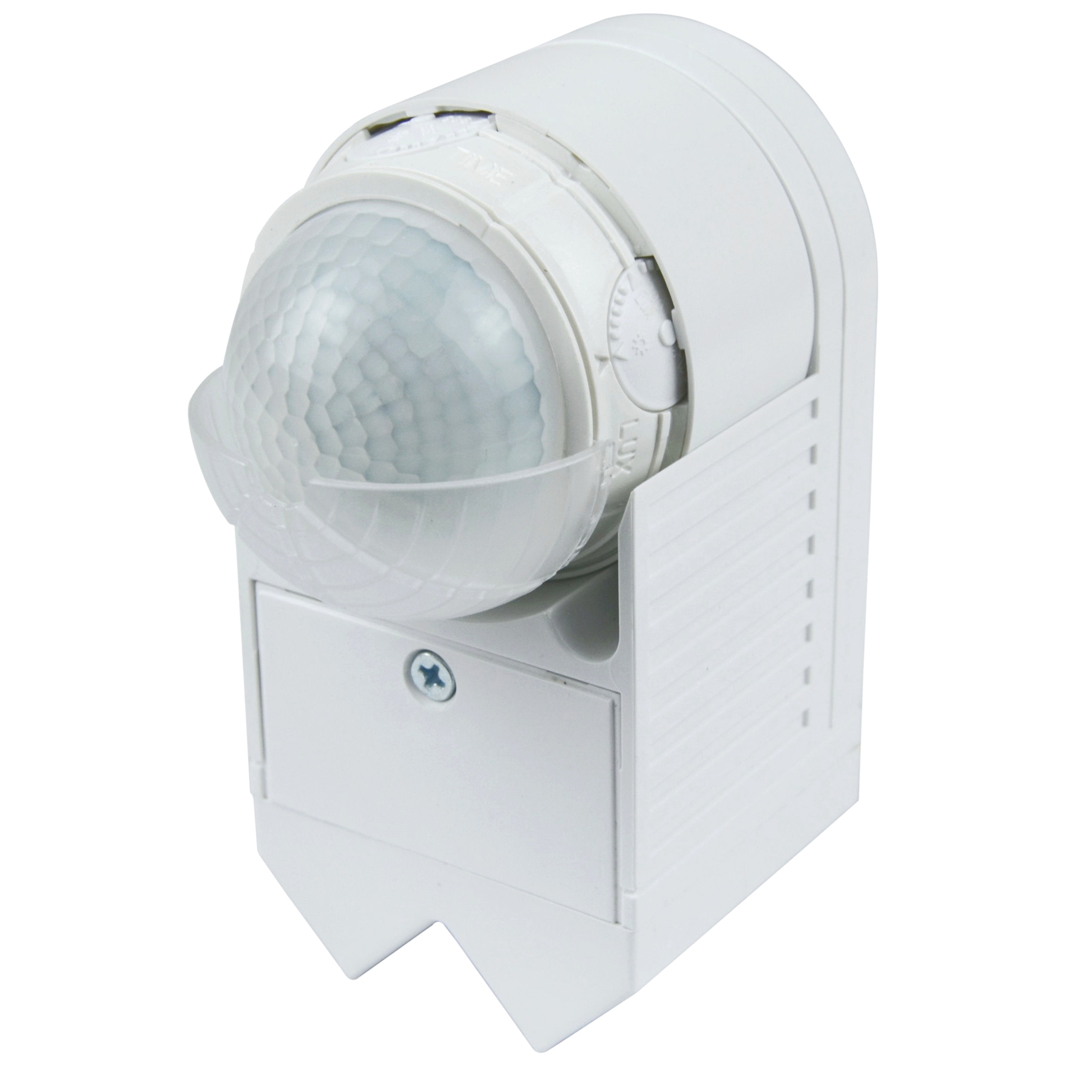 Aufputz Bewegungsmelder für Wand- oder Eckmontage, Erfassungswinkel 360º, Reichweite: bis 12m Radius bei Montagehöhe 2,5m, Ausschaltverzögerung: 10 Sek. bis 15 Min., Dämmerungsschwelle stufenlos einstellbar (3-2000Lux), Schaltleistungen: 1200W ohmsche Last / 300W induktive Last / 80W LED, Temperaturbereich: -20°C bis +40°C, inkl. Eckmontagewinkel und Linsenabdeckung, IP44;