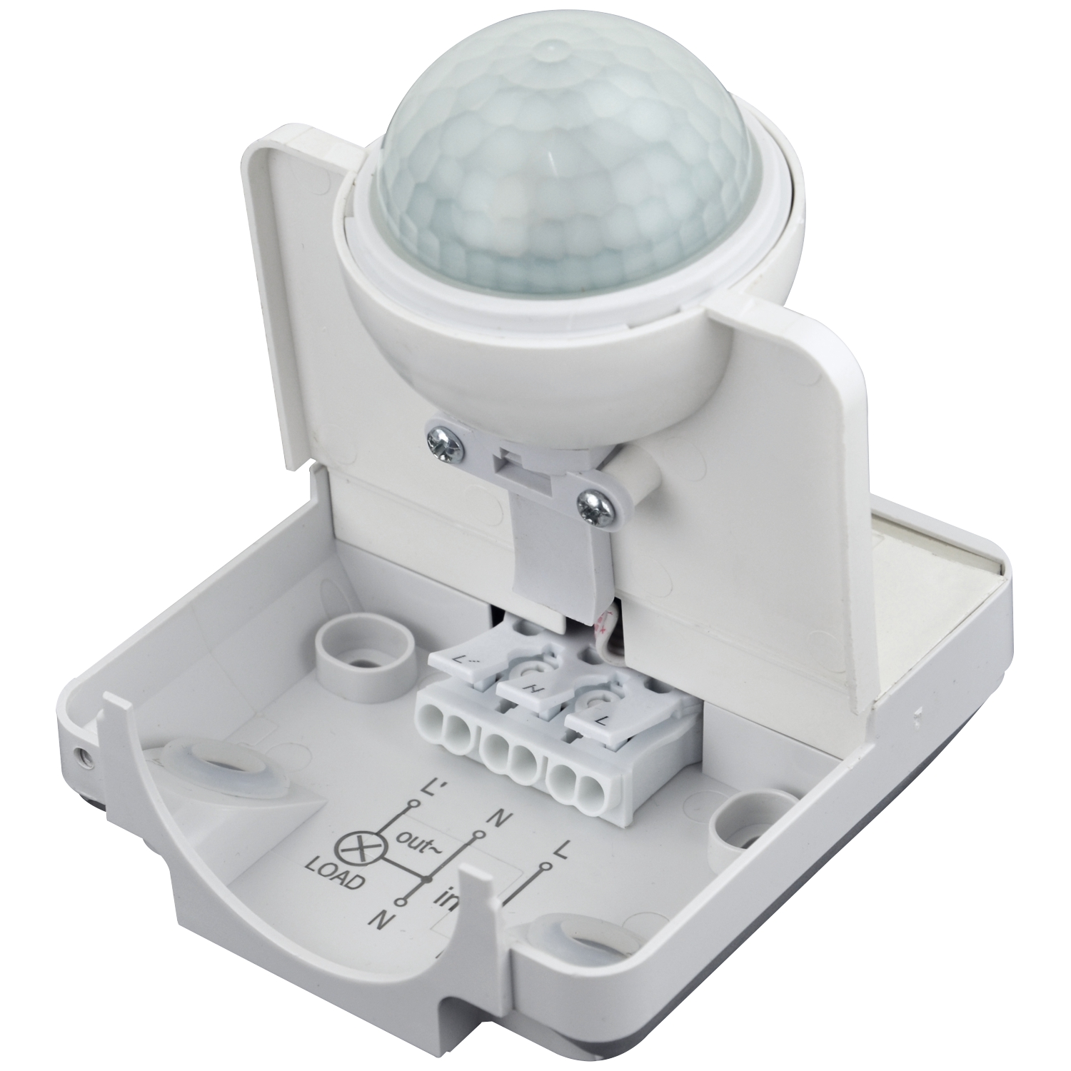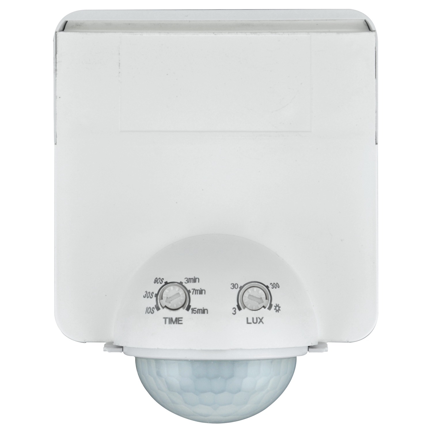 Aufputz Bewegungsmelder für Wandmontage, Erfassungswinkel 360º, Reichweite: bis 8m Radius, Ausschaltverzögerung: 10 Sek. bis 15 Min., Dämmerungsschwelle stufenlos einstellbar (3-2000Lux), Schaltleistungen: 1200W ohmsche Last / 600W elektronische Verbraucher / 600W LED, IP54;