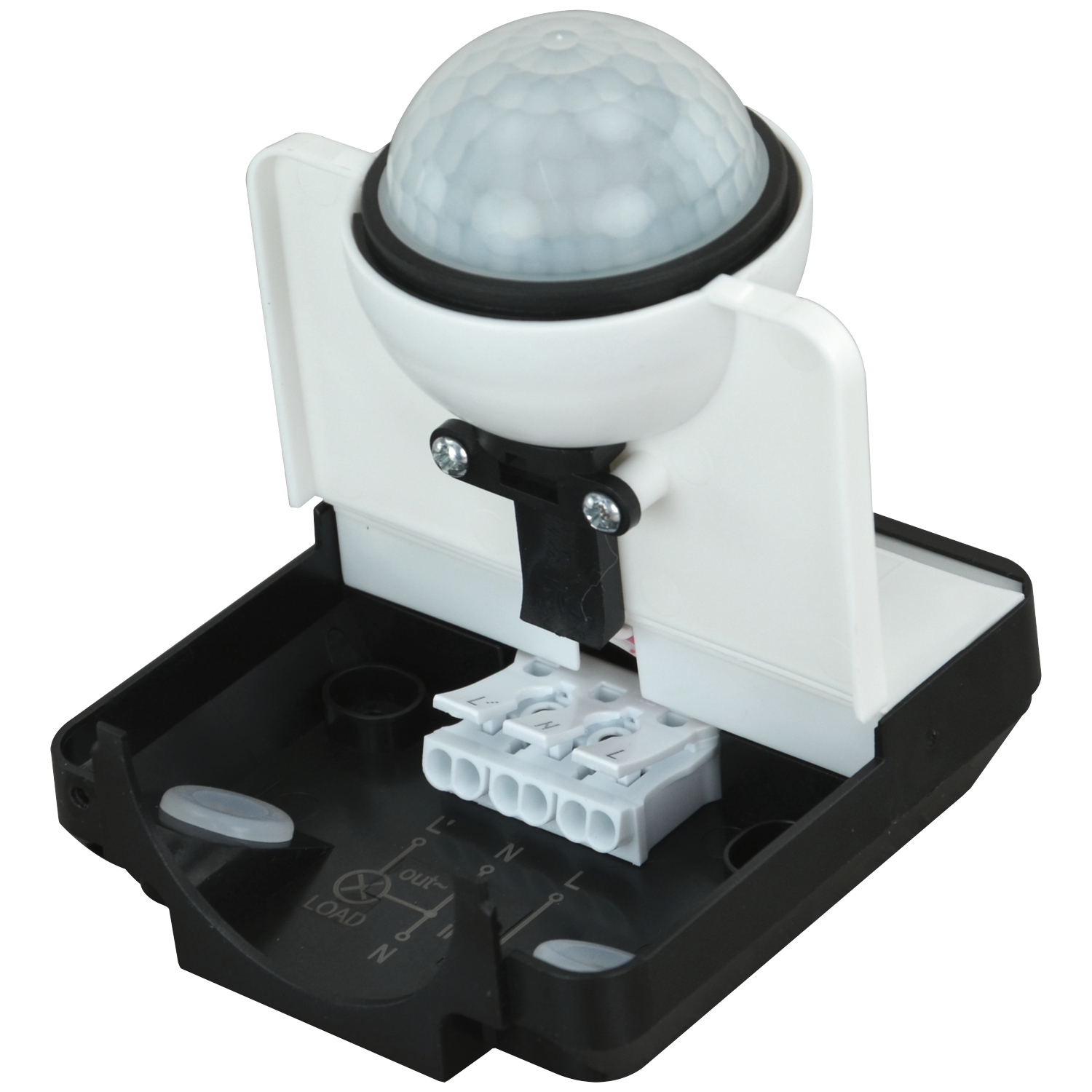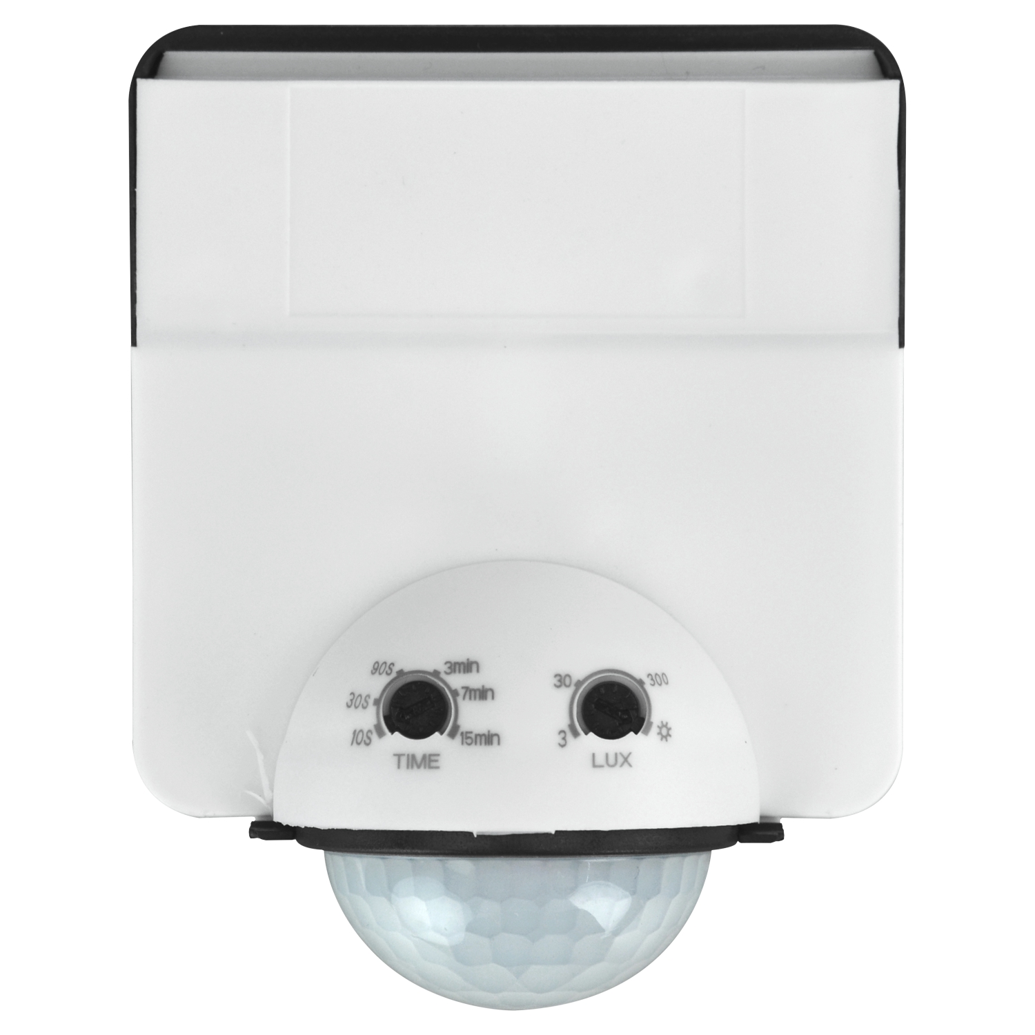 Aufputz Bewegungsmelder für Wandmontage, Erfassungswinkel 360º, Reichweite: bis 8m Radius, Ausschaltverzögerung: 10 Sek. bis 15 Min., Dämmerungsschwelle stufenlos einstellbar (3-2000Lux), Schaltleistungen: 1200W ohmsche Last / 600W elektronische Verbraucher / 600W LED, IP54;