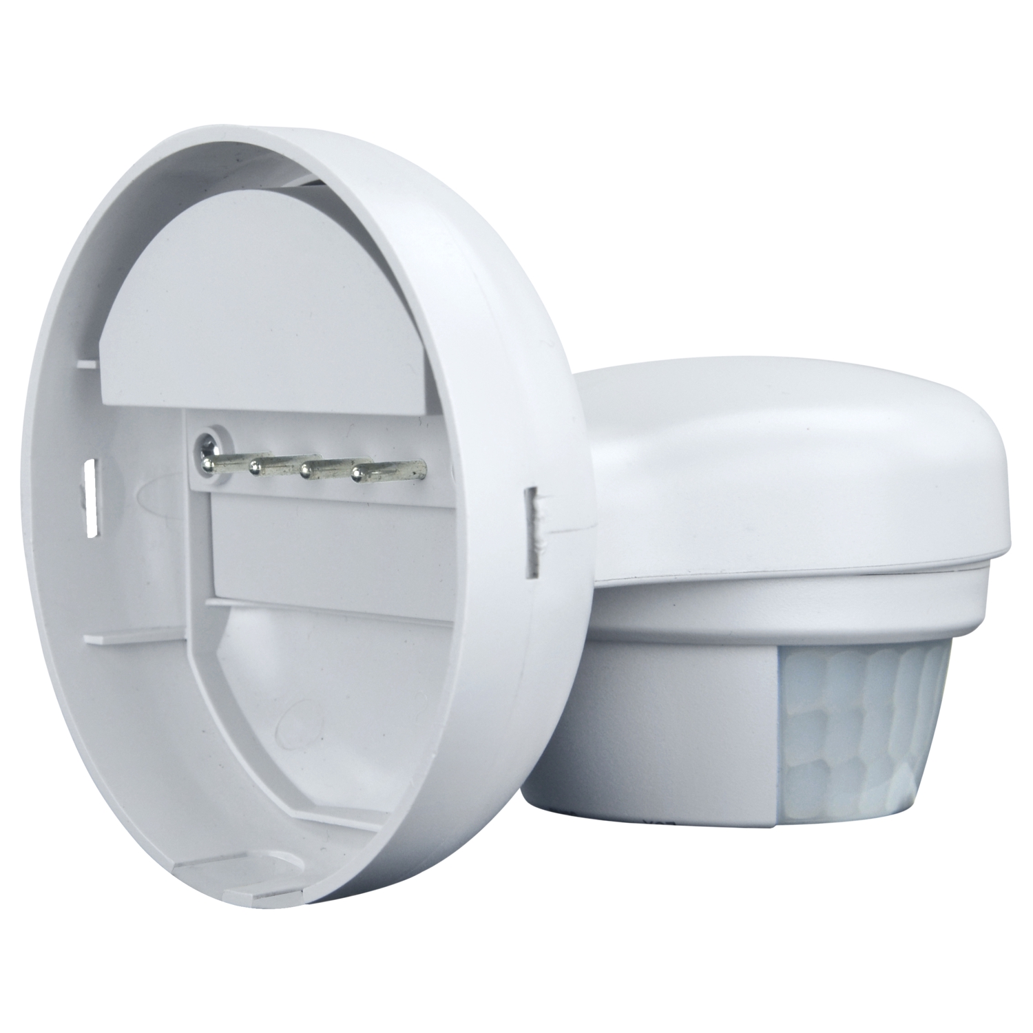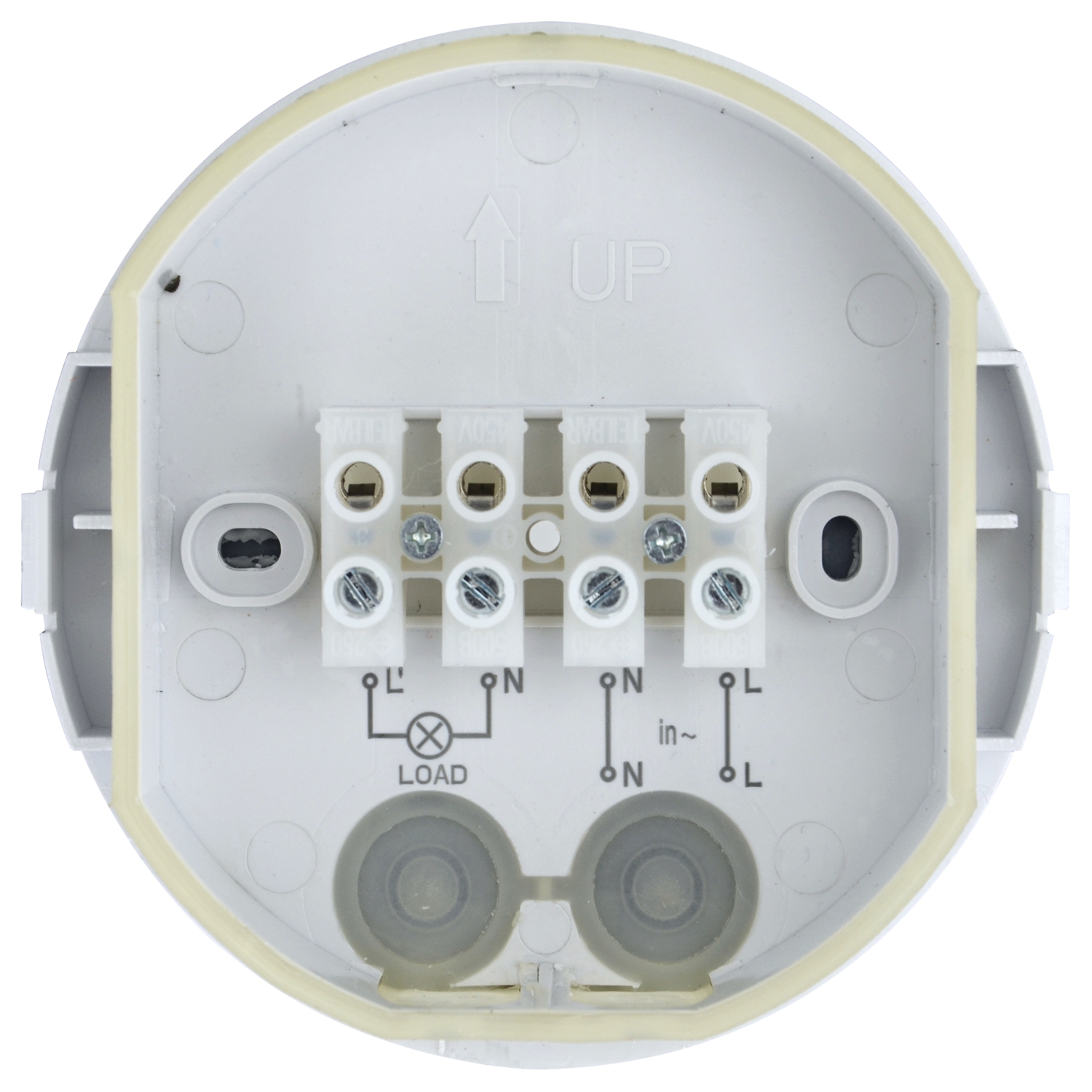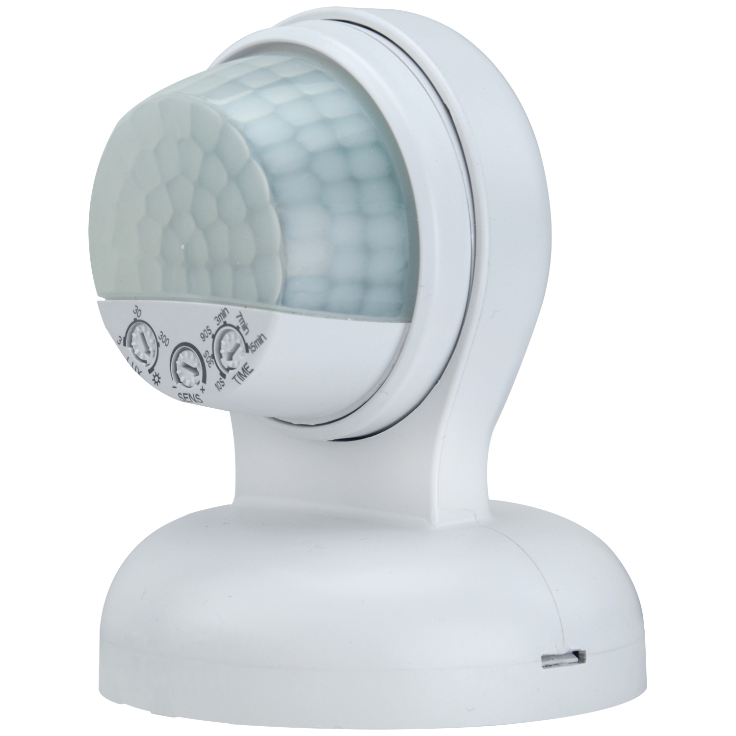 Aufputz Bewegungsmelder für Wandmontage, Erfassungswinkel 240°, Reichweite: bis 14m Radius, Ausschaltverzögerung: 10 Sek. bis 15 Min., Dämmerungsschwelle stufenlos einstellbar (3-2000Lux), Schaltleistungen: 1200W ohmsche Last / 600W elektronische Last / 600W LED, IP65;
