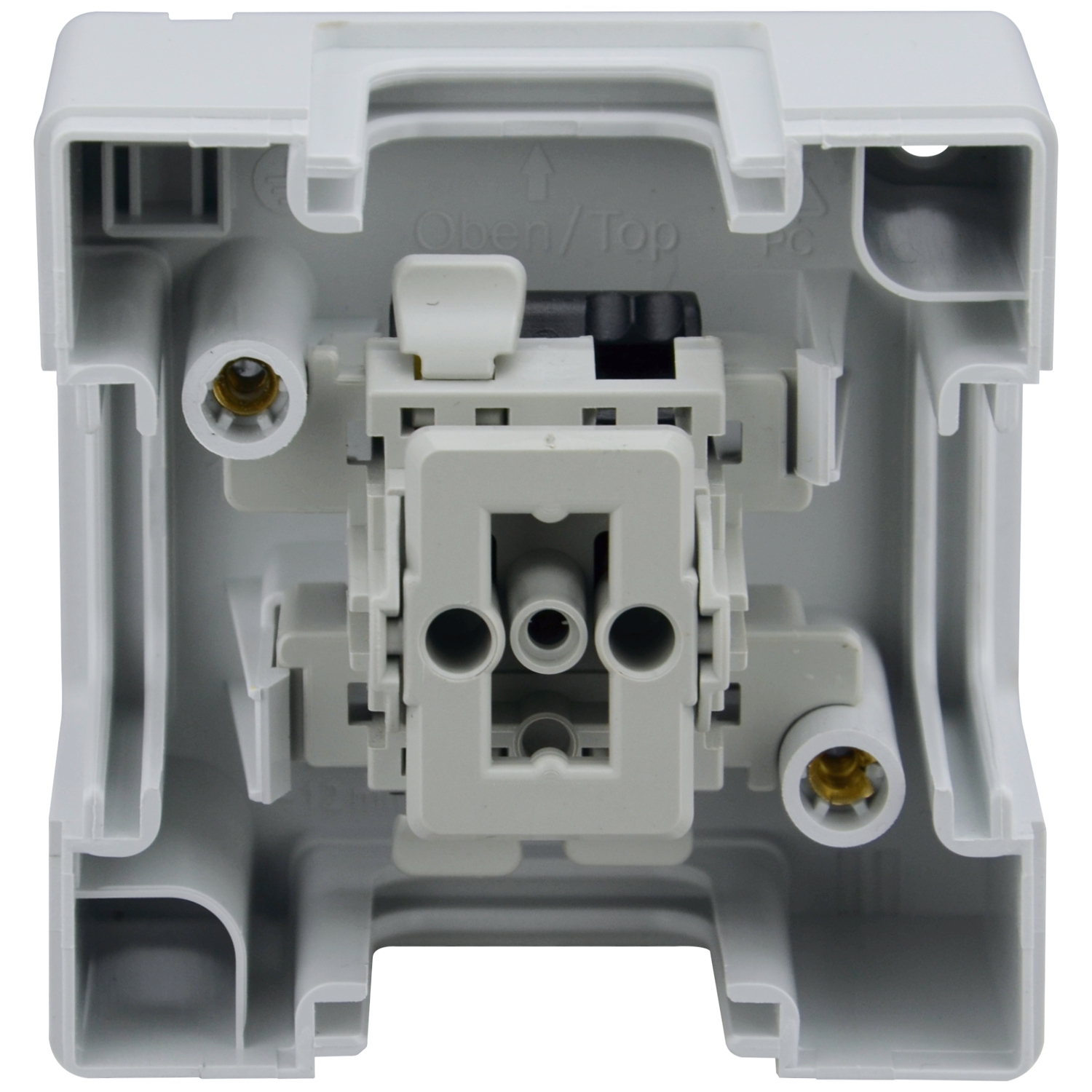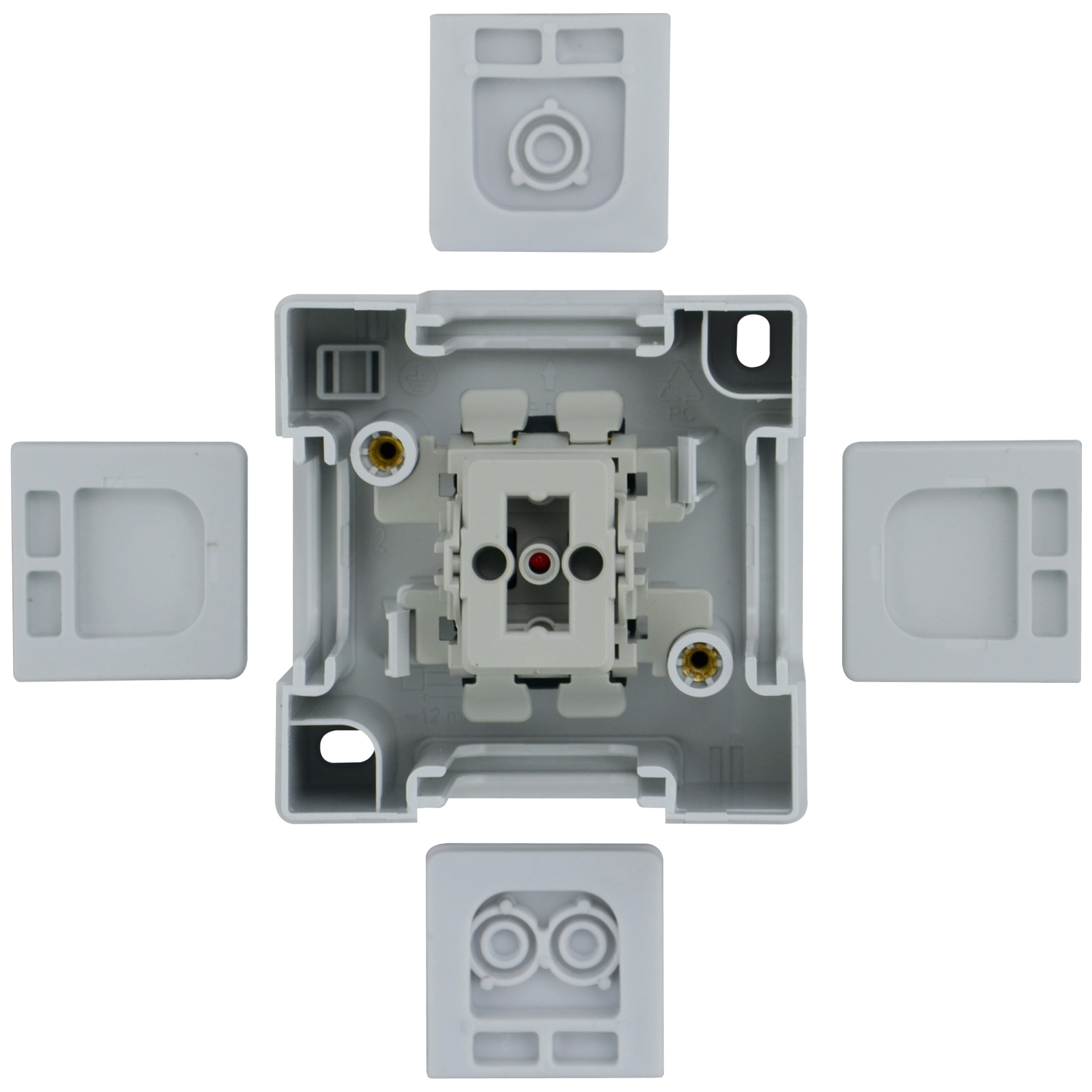 Feuchtraum-Aufputz Kreuzschalter VARIO21, Beschriftungsfeld, Material Polycarbonat, Halogen- und PVC frei, hellgrau/dunkelgrau, Temperaturbereich -30 bis +70°C, 4 Kabeleinführungen, schlagfest IK10, IP44, 10A, 250VAC