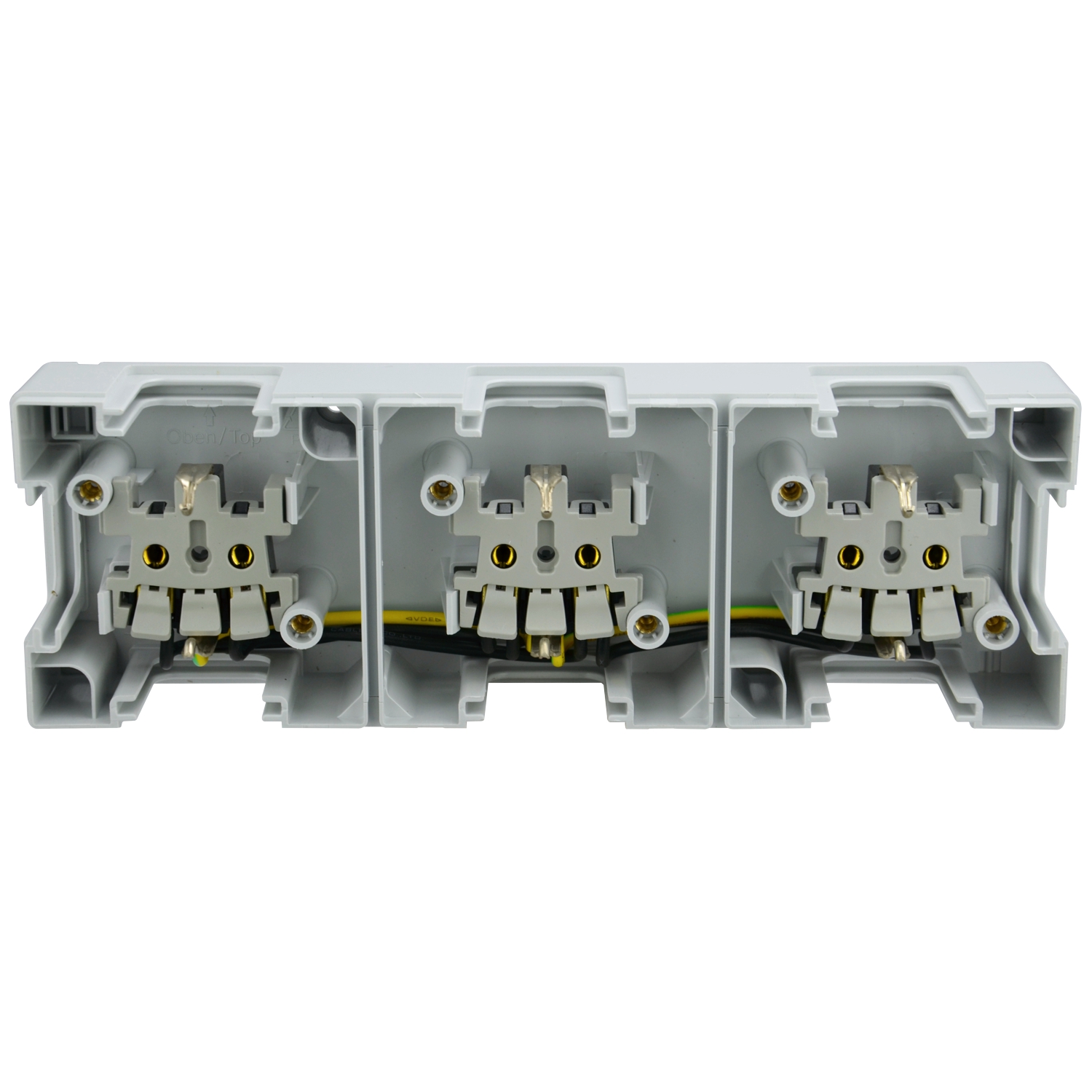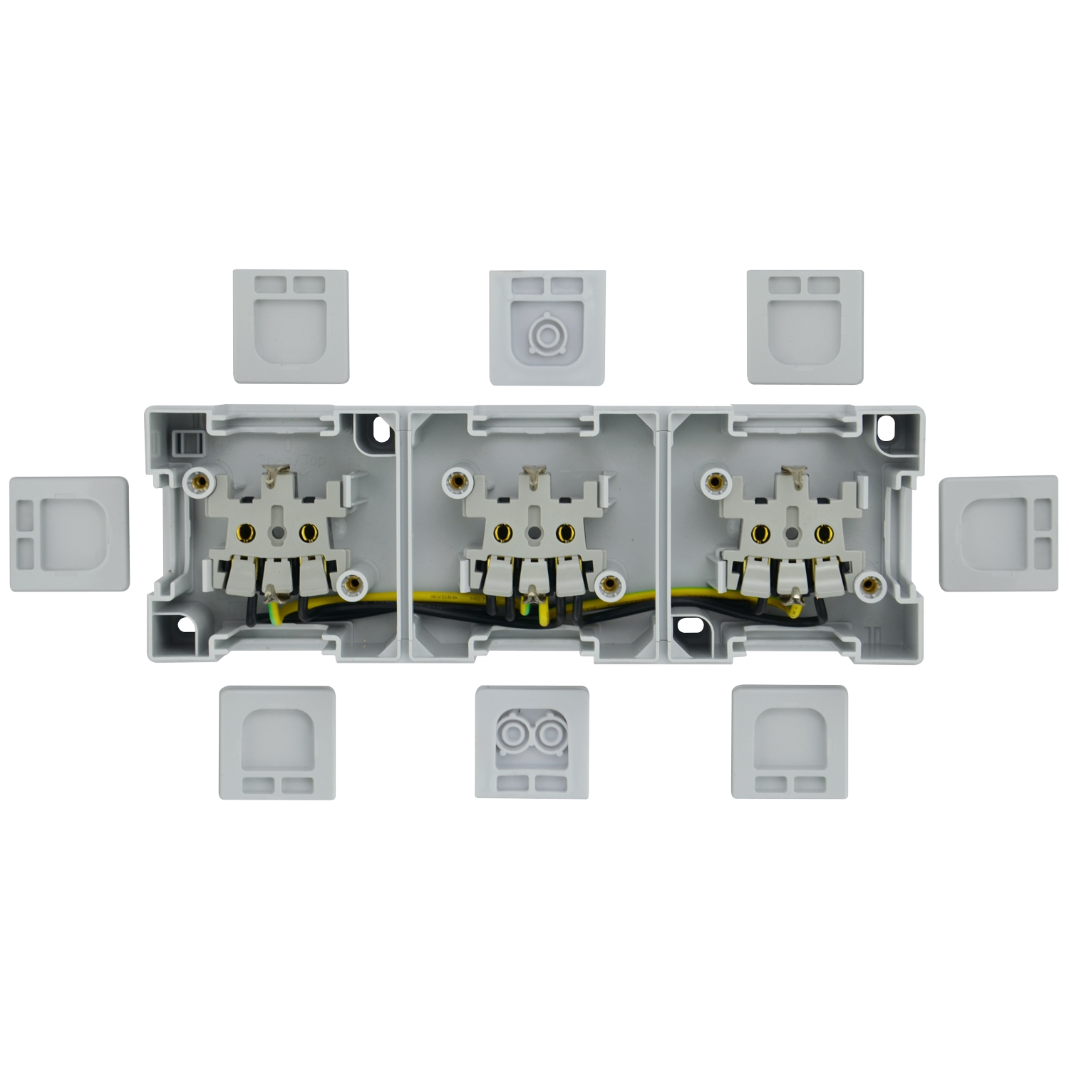 Feuchtraum-Aufputz Schutzkontakt-Steckdose 3-fach waagrecht VARIO21, Klappdeckel mit Beschriftungsfeld, Material Polycarbonat, Halogen- und PVC-frei, hellgrau/dunkelgrau, Temperaturbereich -30 bis +70°C, 8 Kabeleinführungen, verdrahtet, schlagfest IK10, IP44, 16A, 250VAC