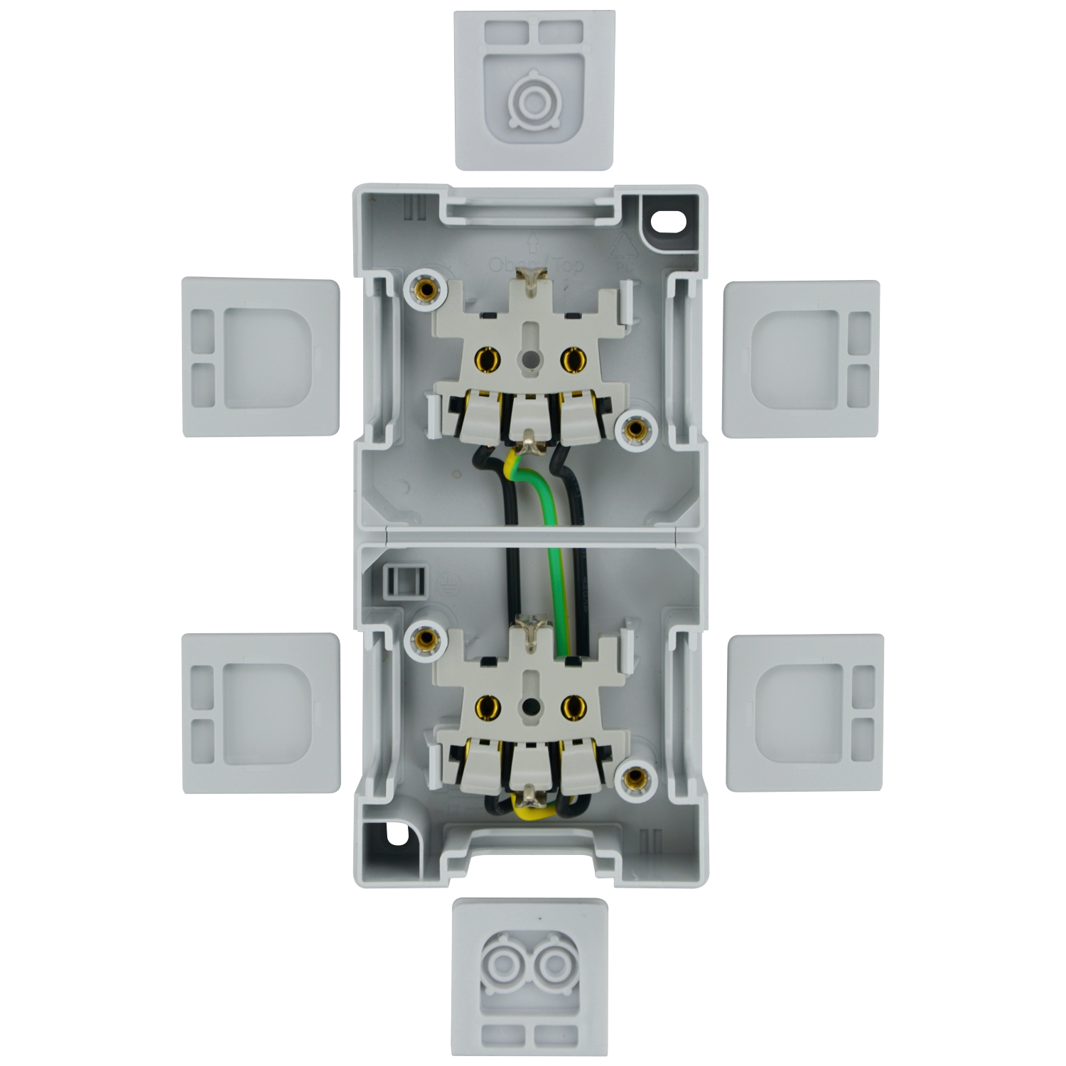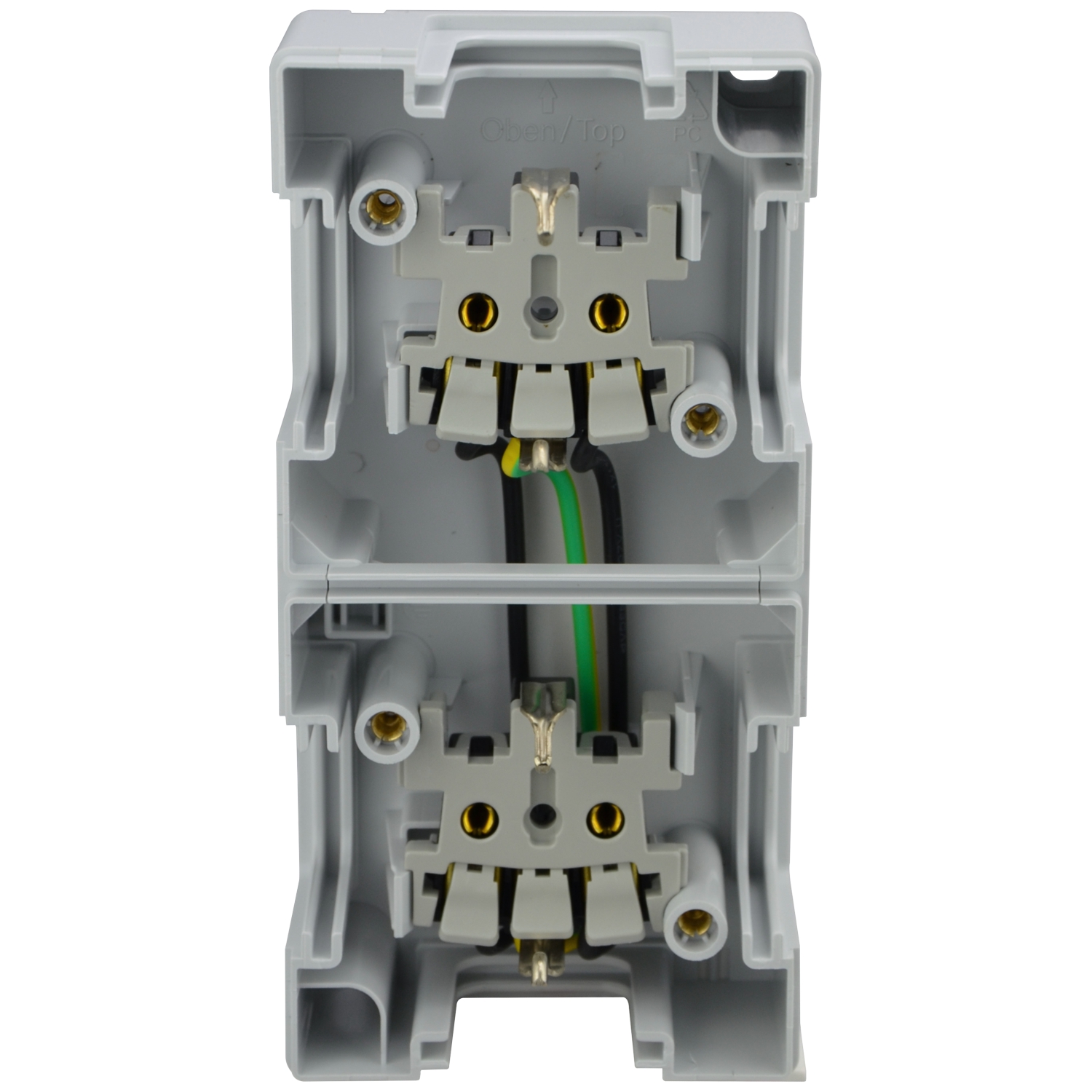 Feuchtraum-Aufputz Schutzkontakt-Steckdose 2-fach senkrecht VARIO21, Klappdeckel mit Beschriftungsfeld, Material Polycarbonat, Halogen- und PVC-frei, hellgrau/dunkelgrau, Temperaturbereich -30 bis +70°C, 6 Kabeleinführungen, verdrahtet, schlagfest IK10, IP44, 16A, 250VAC