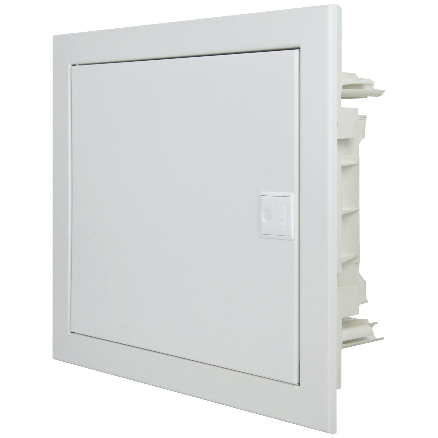 Unterputz-Verteiler zur Montage in Wänden aller Art, bestehend aus Unterteil (Mauerwanne) und Oberteil, Mauerwanne aus Kunststoff, Tür+Rahmen aus Stahlblech RAL 9003, inkl. Hohlwand-Montagesatz, Glühdrahttest: 850°C nach IEC 60670-24, halogenfrei, IP40;