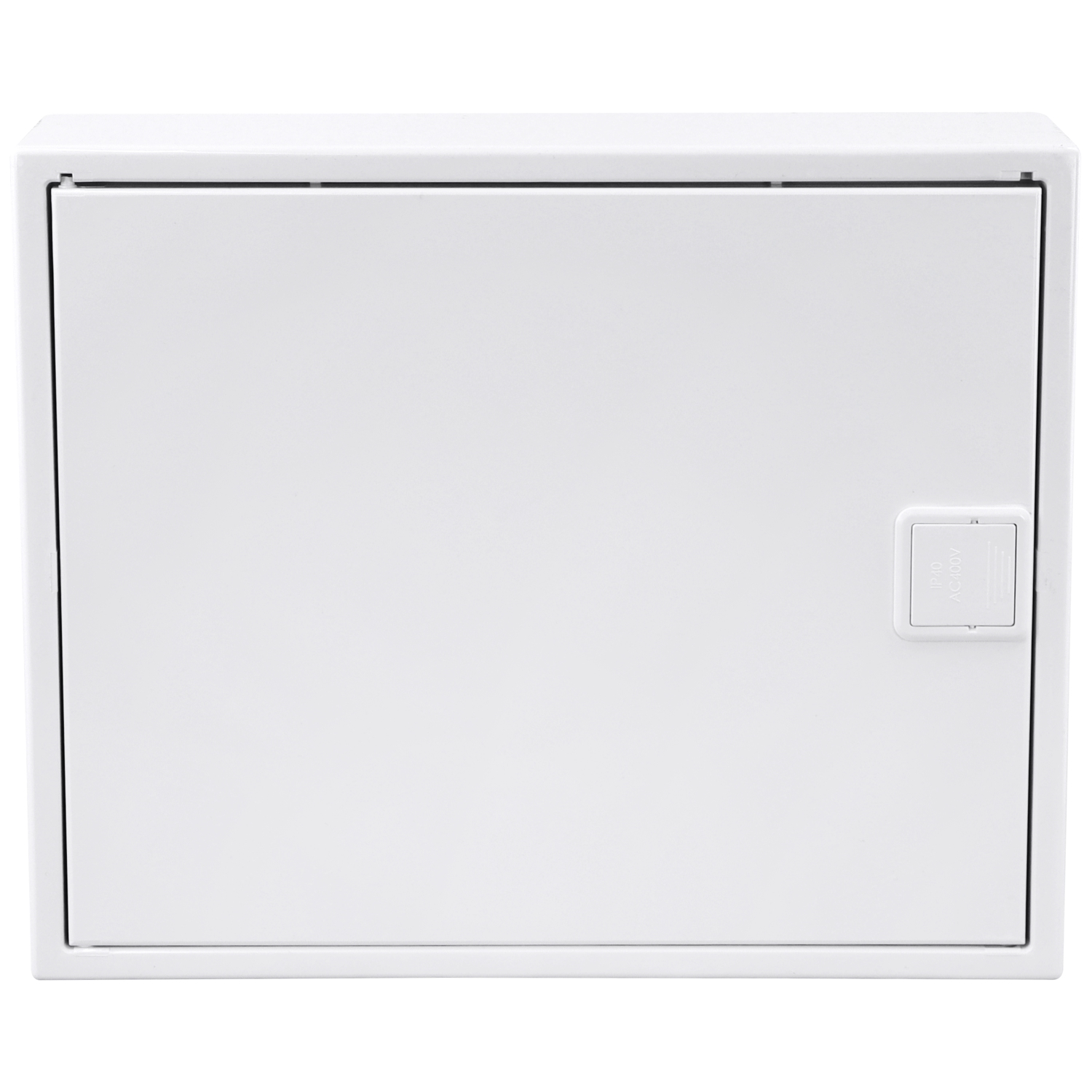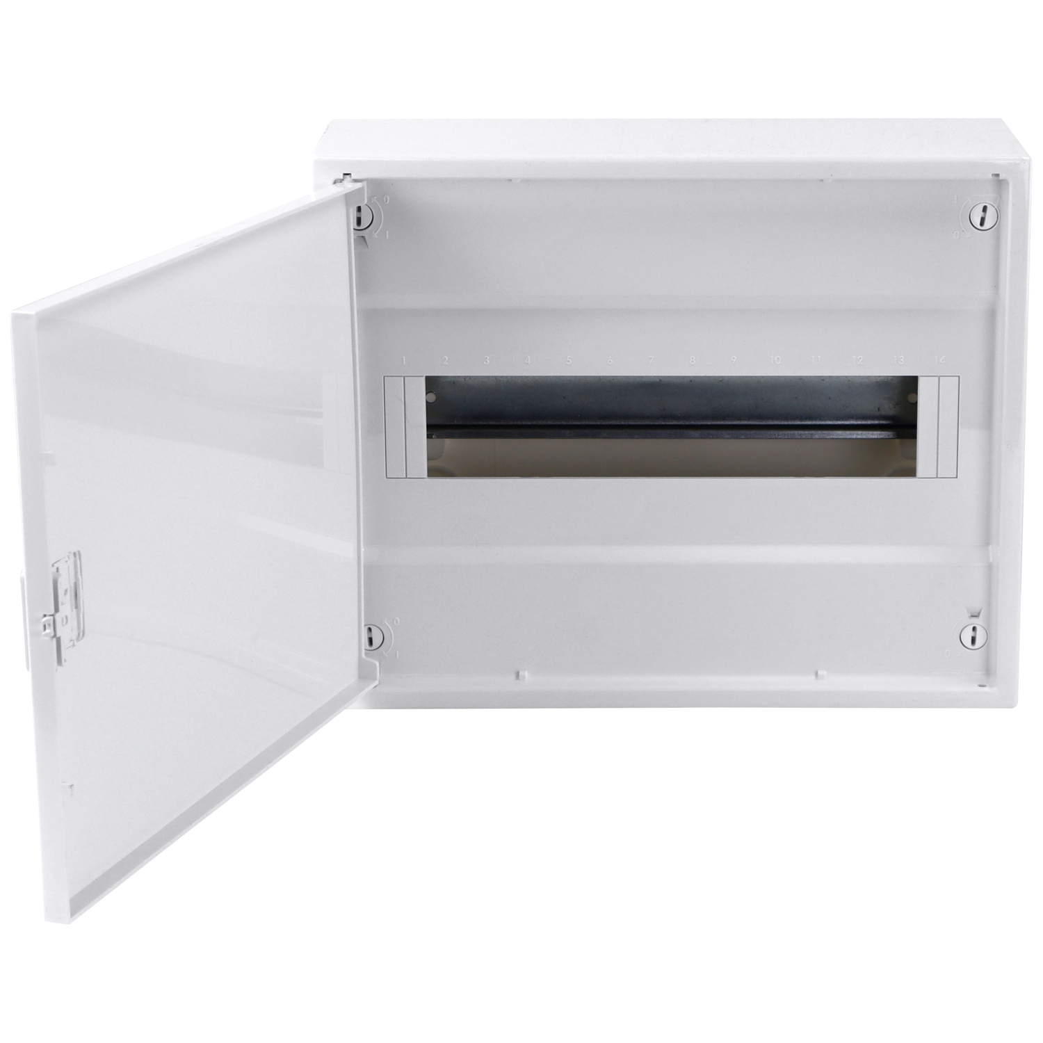 Aufputz-Verteiler aus Kunststoff mit Tür (kann auch entfernt werden), 12(14)TE, IP40, Bemessungsspannung: 400V, Bemessungsstrom: 63A, Material: Kunststoff, Glühdrahttest: 650°C, inkl. Klemm-Material, Anzahl der PE/N Anschlüsse: 10/10;