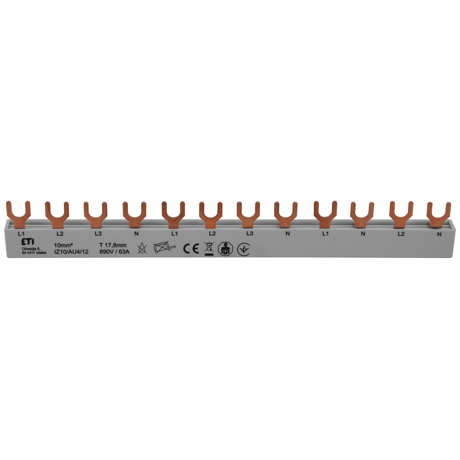 Vorkonfektionierte Gabel-Sammelschiene inkl. Endkappen, 4-polig / 12 TE (L1 - L2 - L3 - N - L1 - L2 - L3 - N - L1 - N - L2 - N), Querschnitt: 10mm²;