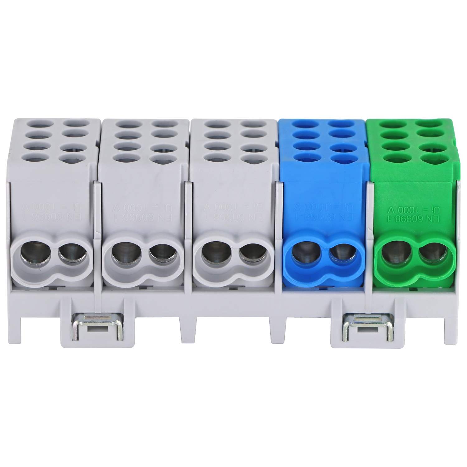 Hauptleitungsklemmblock 5polig wartungsfrei, geeignet für Kupfer- und Aluminiumleiter, Nennstrom: 130/100A, Klemmbereich: 1.5mm² bis 25mm², 4 Anschlüsse pro Pol, Schnellmontage auf Hutschiene;