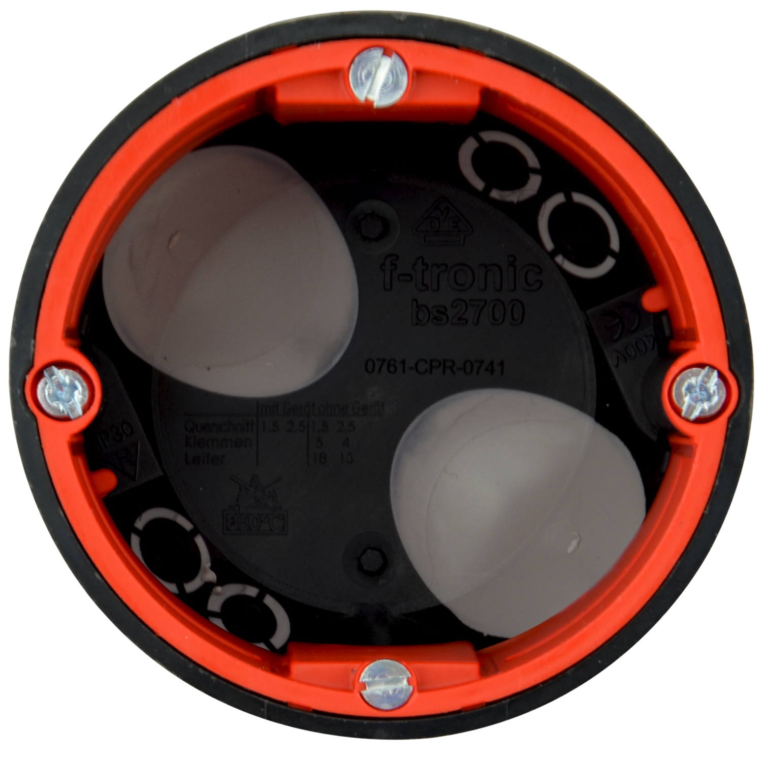 Brandschutzdose mit Durchstoßmembran, Fräsloch 68mm, anreihbar, Material hochfester und temperaturbeständiger Spezialkunststoff, Feuerwiderstandsklasse bis EI 120, Einführungen: Durchstoßmembran 2x ≤M25/ 2x Kabel (3x1,5mm²)/ 2x Kabel (3x2,5mm²/5x1,5mm²), IP30, halogenfrei;