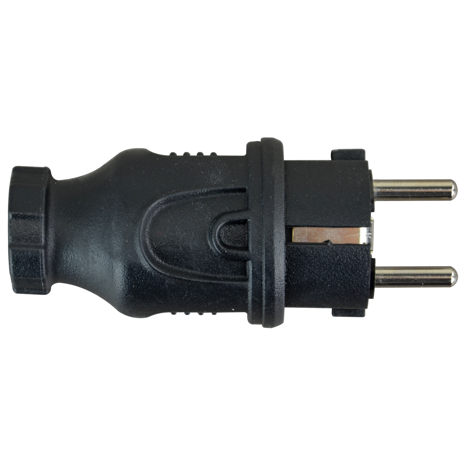 Schutzkontakt-Gummistecker aus Kunststoff (PVC), mit Zugentlastung, Nennspannung: 250V, Nennstrom: 16A, Leitungsquerschnitt: max. 2.5mm², Schutzart: IP44;