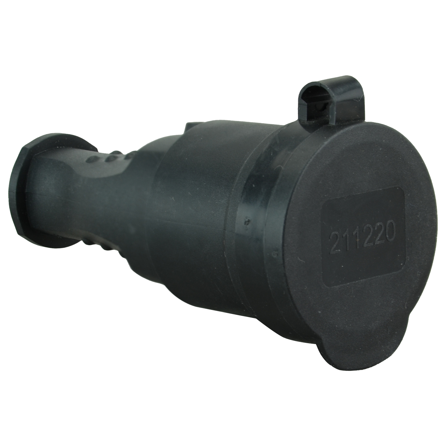 Schutzkontakt-Vollgummikupplung mit Deckel aus Kunststoff (TPE), mit Zugentlastung, Nennspannung: 250V, Nennstrom: 16A, Leitungsquerschnitt: max. 2.5mm², Schutzart: IP44;