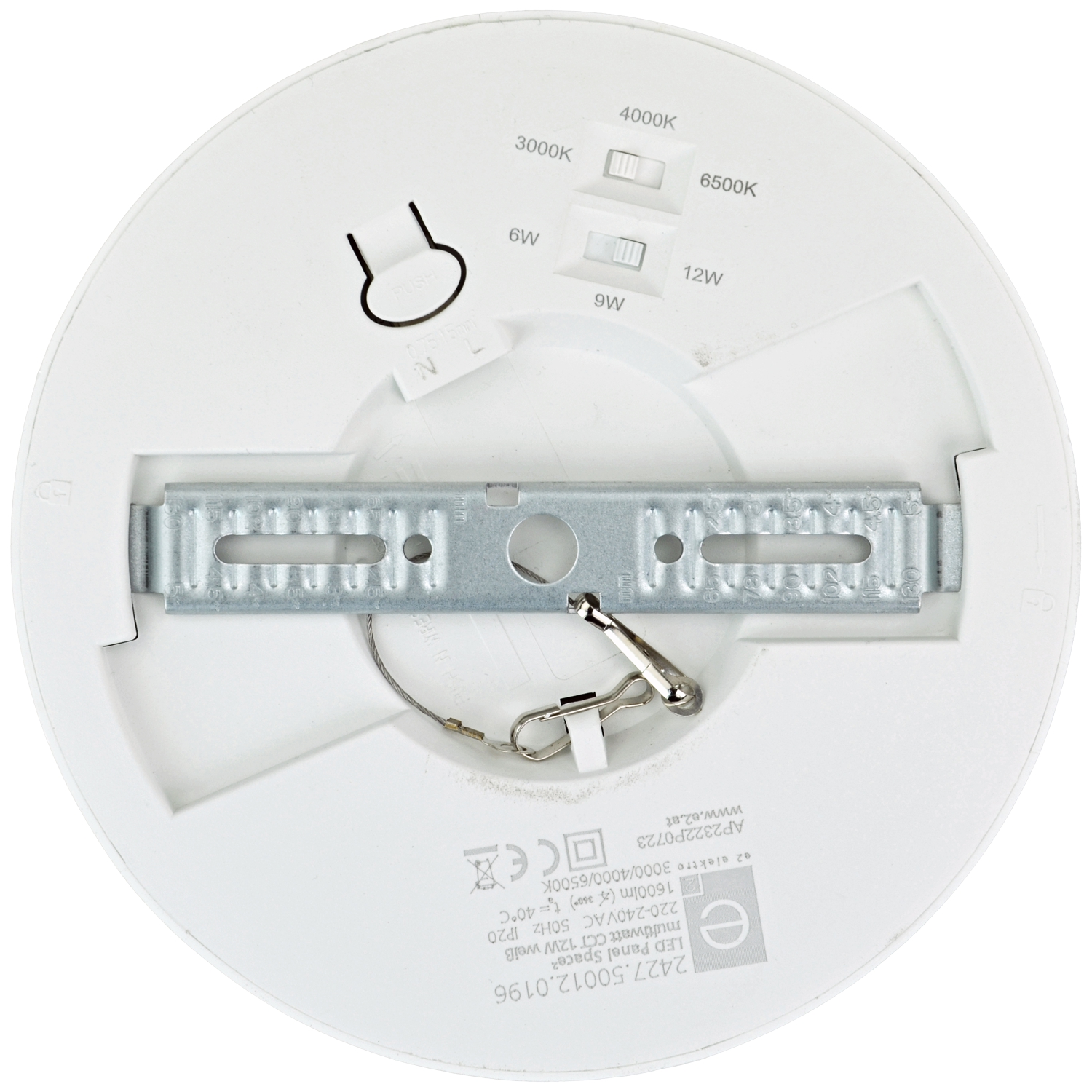 LED Panel mit flexiblem Montagebügel zur Anbau- oder Einbaumontage mit Klappfedern in Ausschnitt Ø65-155mm, weißer Kunststoffrahmen, Gehäuse aus Polypropylen, Abdeckung opal, Lichtleistung 3-stufig einstellbar 12W/9W/6W, 1600lm bei 12W, Lichtfarbe 3000/4000/6500K an Gehäuserückseite umschaltbar, inkl. LED Treiber, durchschnittliche LED Lebensdauer 25.000h, CRI>80, Abstrahlwinkel 117°, nicht dimmbar, Schutzart IP20, SK II, 220-240V 50Hz, Temperaturbereich: -10°C bis +40°C;