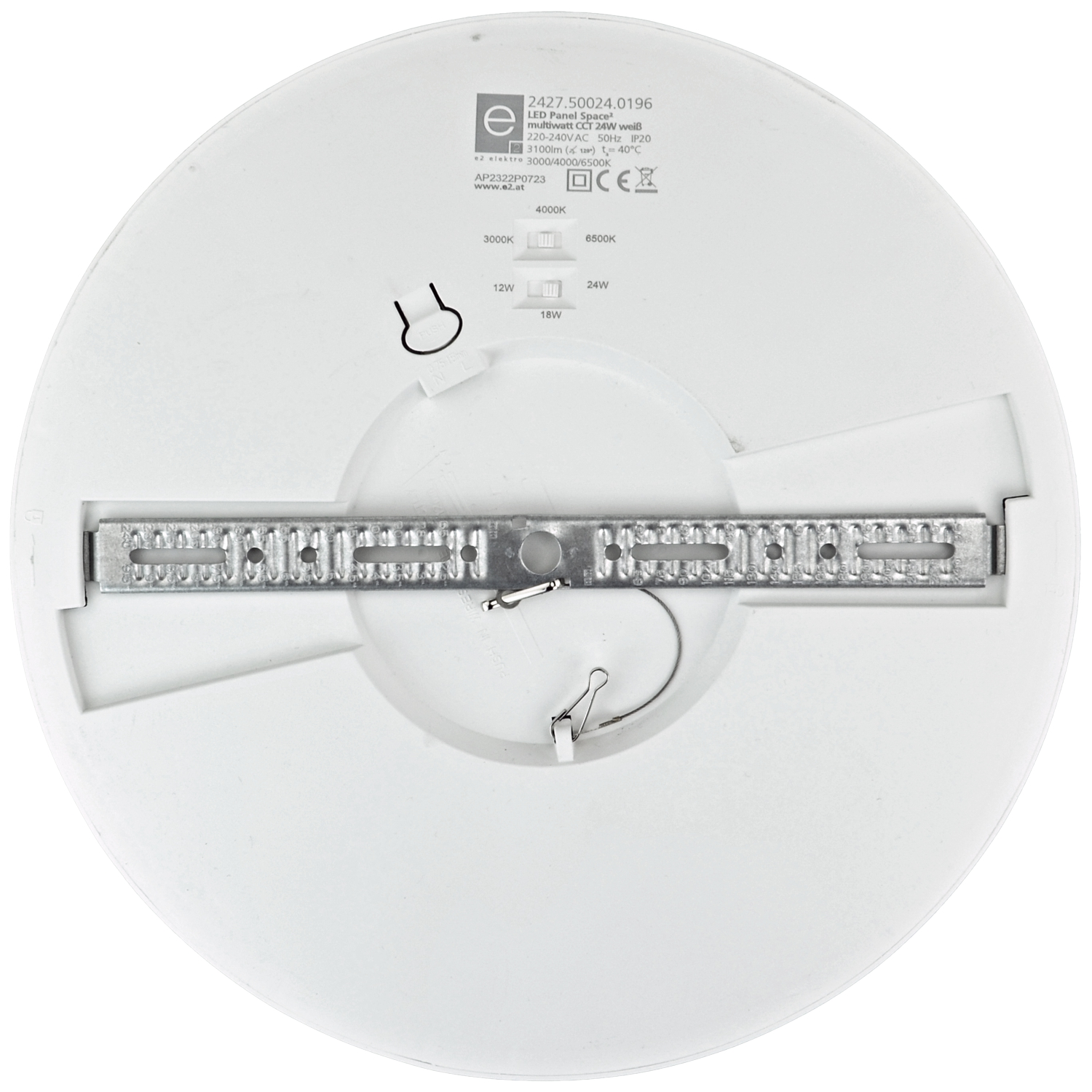 LED Panel mit flexiblem Montagebügel zur Anbau- oder Einbaumontage mit Klappfedern in Ausschnitt Ø65-280mm, weißer Kunststoffrahmen, Gehäuse aus Polypropylen, Abdeckung opal, Lichtleistung 3-stufig einstellbar 24W/18W/12W, 3200lm bei 24W, Lichtfarbe 3000/4000/6500K an Gehäuserückseite umschaltbar, inkl. LED Treiber, durchschnittliche LED Lebensdauer 25.000h, CRI>80, Abstrahlwinkel 117°, nicht dimmbar, Schutzart IP20, SK II, 220-240V 50Hz, Temperaturbereich: -10°C bis +40°C;