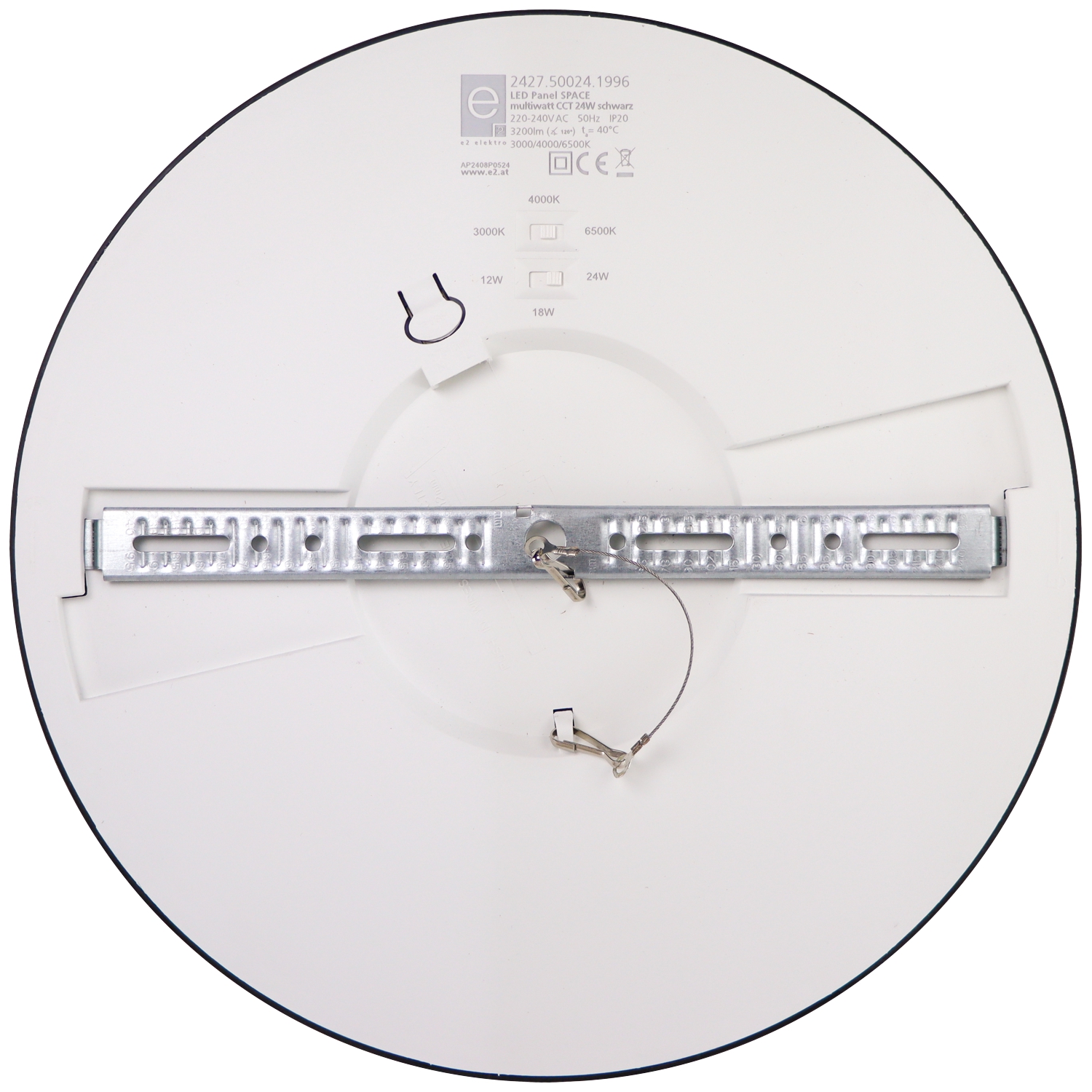 LED Panel mit flexiblem Montagebügel zur Anbau- oder Einbaumontage mit Klappfedern in Ausschnitt Ø65-280mm, schwarzer Kunststoffrahmen, Gehäuse aus Polypropylen, Abdeckung opal, Lichtleistung 3-stufig einstellbar 24W/18W/12W, 3200lm bei 24W, Lichtfarbe 3000/4000/6500K an Gehäuserückseite umschaltbar, inkl. LED Treiber, durchschnittliche LED Lebensdauer 25.000h, CRI>80, Abstrahlwinkel 117°, nicht dimmbar, Schutzart IP20, SK II, 220-240V 50Hz, Temperaturbereich: -10°C bis +40°C;