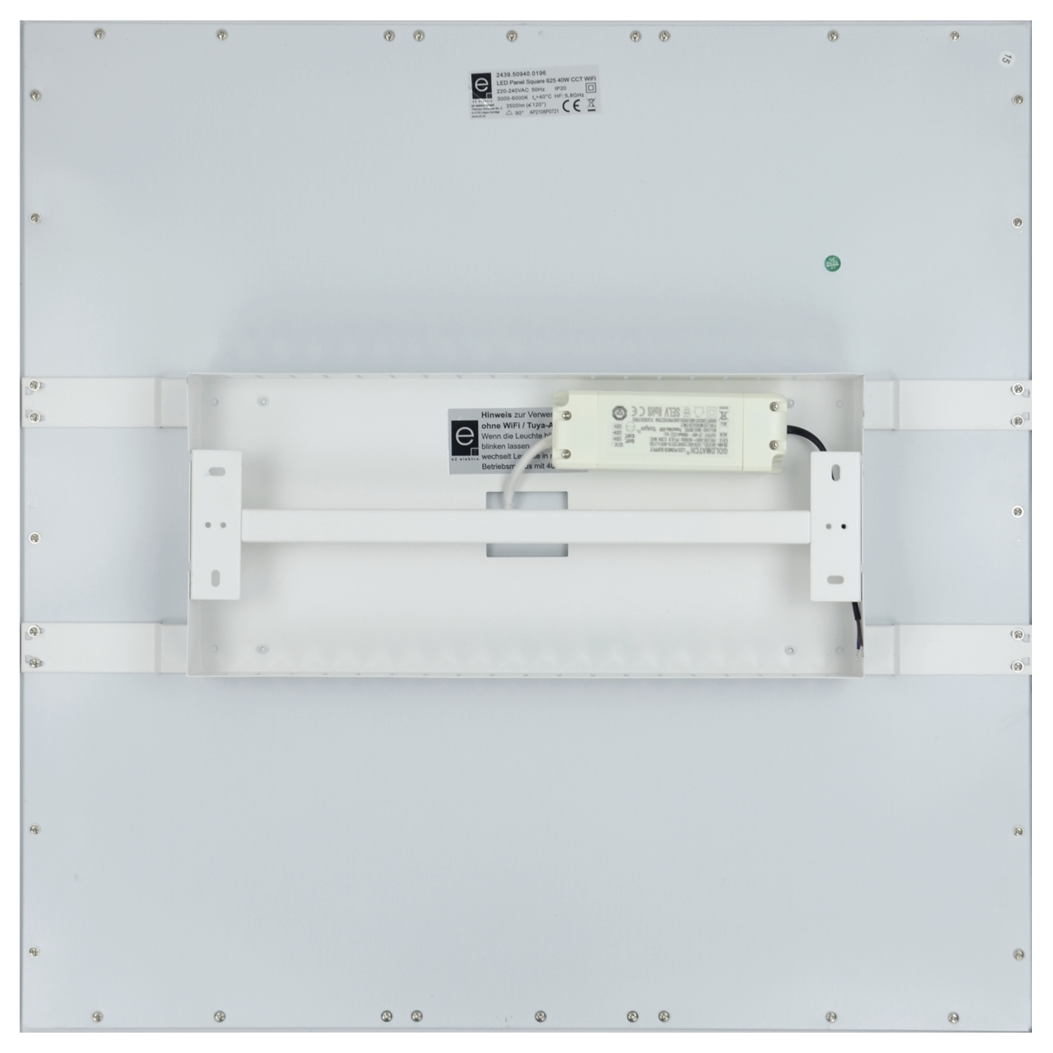 Universelles Panel: Deckenaufbau, -einbau oder Einlegen in Raster 625x625, 40W, Lichtfarbe einstellbar (3000/4000/6000K - nur mit Tuya-App), Lichtfarbe ohne App-Steuerung 4000K, SK II, CRI=84, Abstrahlwinkel: 90°, 30.000h, IP20, 220-240V AC 50Hz, Gehäuse Aluminium/Rückwand Stahlblech, mikroprismatischer Diffusor aus PS, UV-beständige Lichtleiterplatte aus PMMA, Bildschirmtauglich UGR<19, dimmbar (nur mit Tuya-App), LED fix verbaut - Austausch nicht möglich, Temperaturbereich: -10°C bis +40°C; inkl. LED-Treiber (austauschbar)