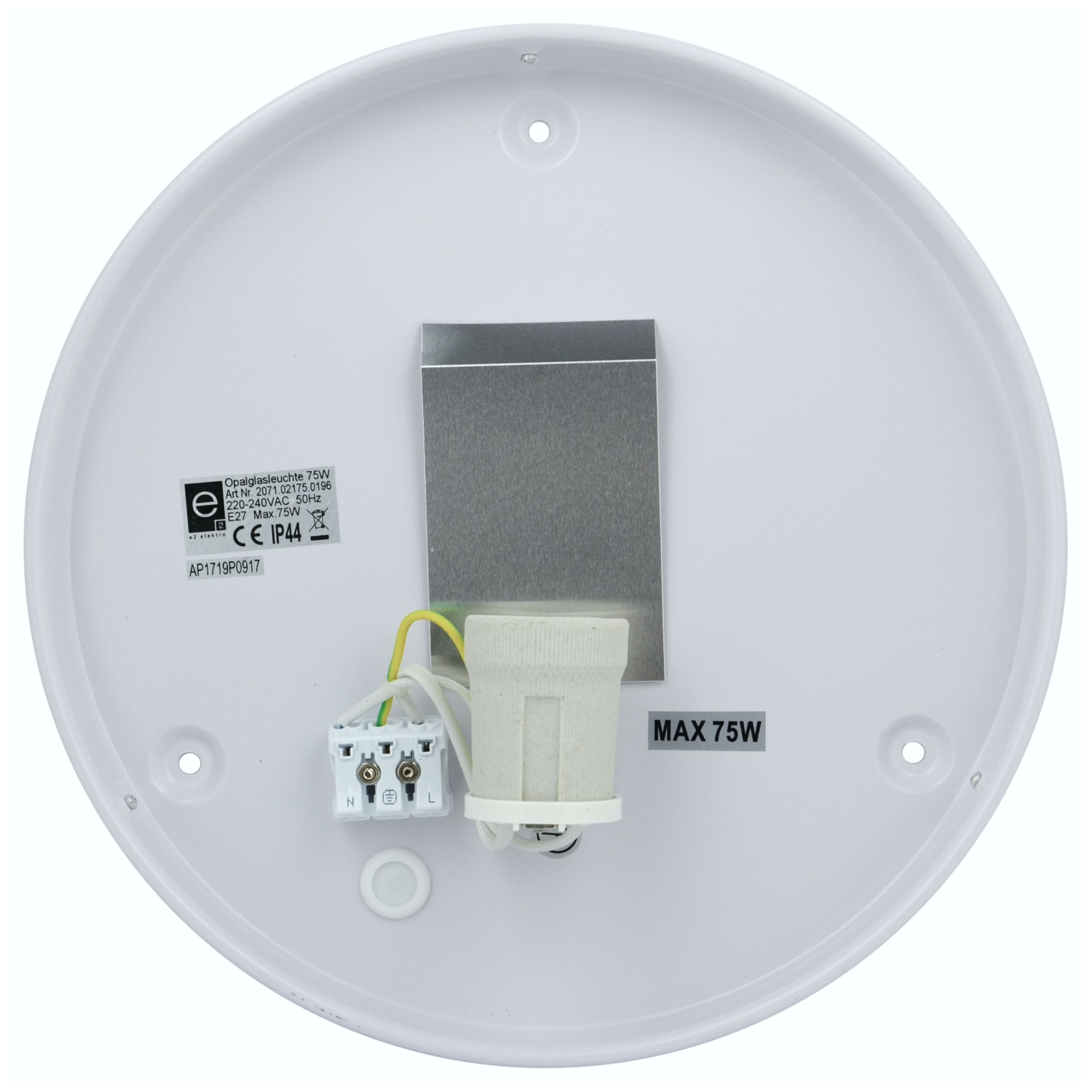 Opalglasleuchte für Decken- oder Wandmontage, 1x E27 Fassung max. 75W, Halterung aus Stahlblech weiß pulverbeschichtet, Steckklemmenanschluss, Bajonettverschluss, Abdeckung Opalglas TRIPLEX 3-fach beschichtet weiß matt, Temperaturbereich: -15 bis +45°C,SK I, IP44; Leuchtmittel nicht enthalten;