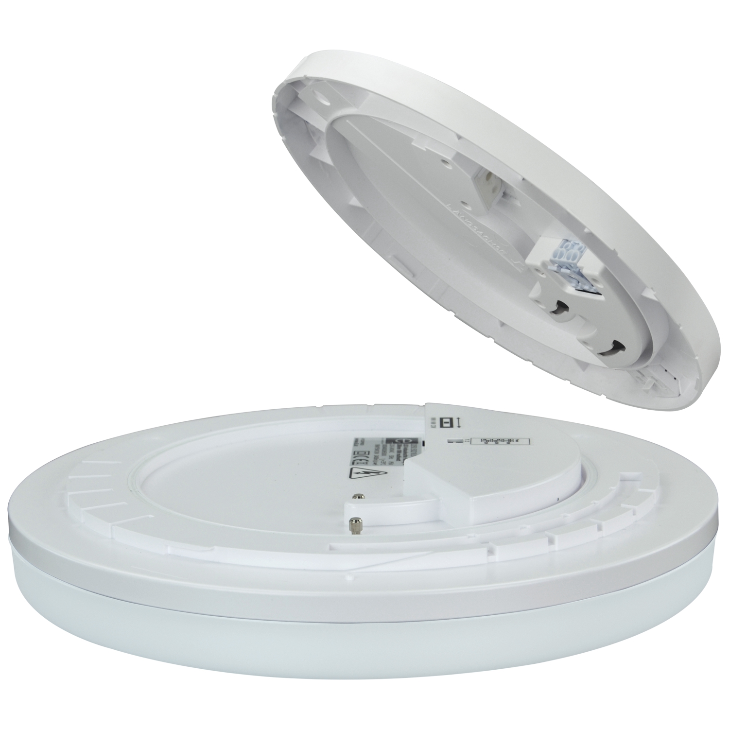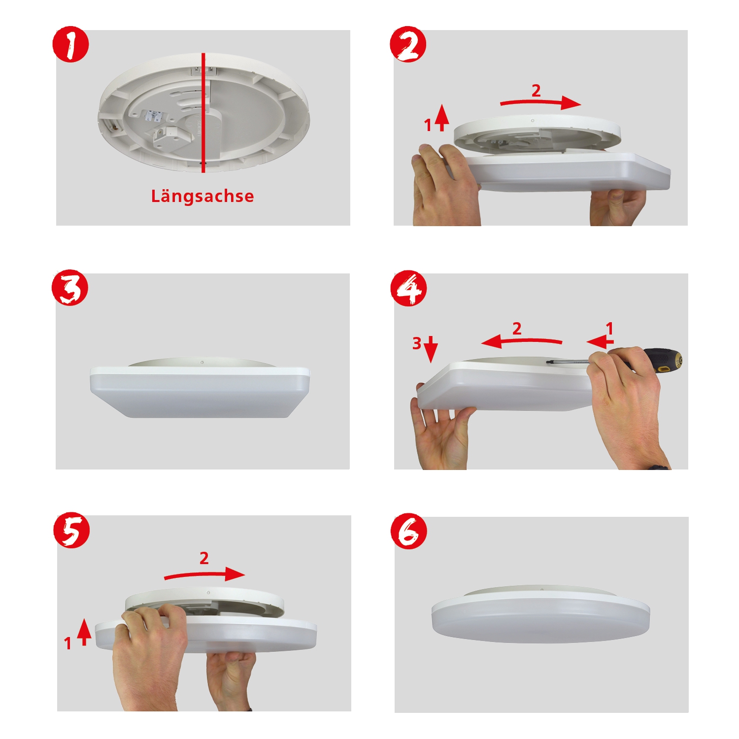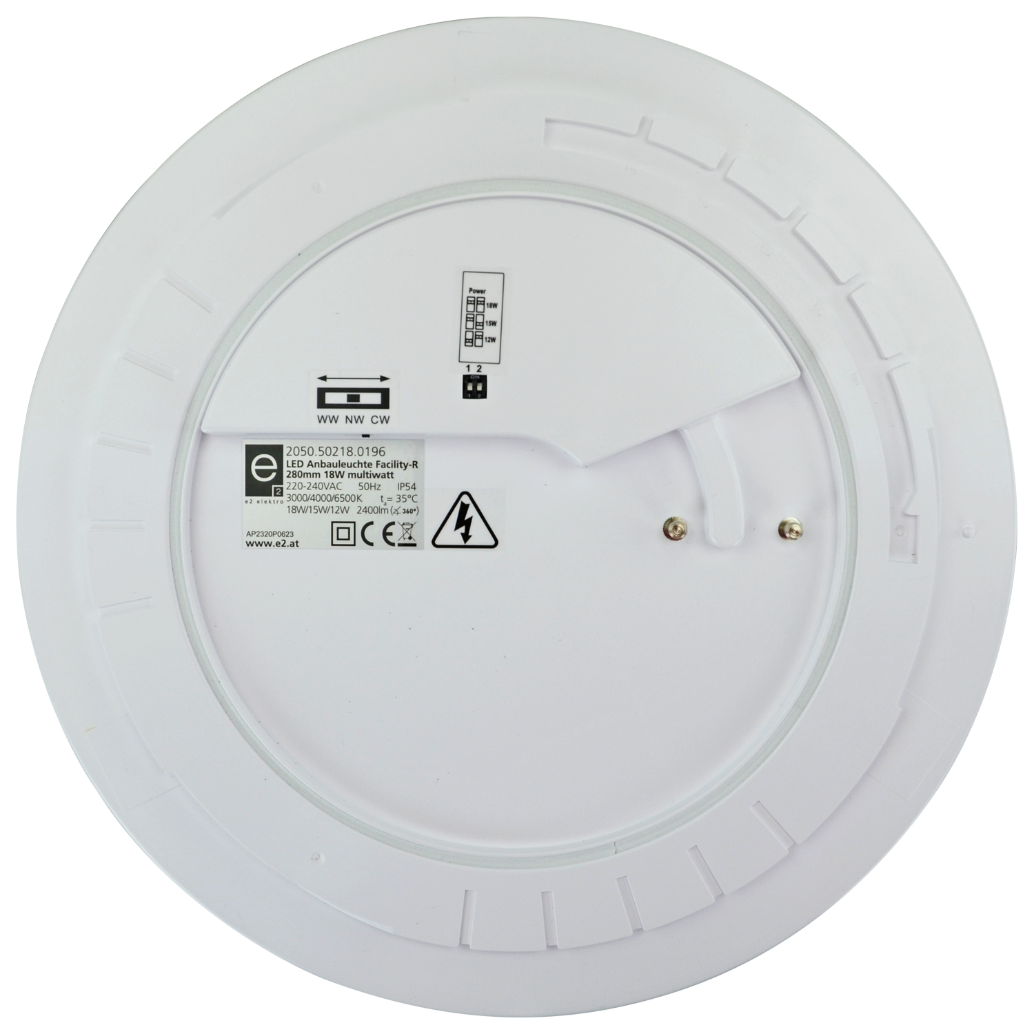 Anbauleuchte mit wechsel- bzw. austauschbarer Leuchteinheit, Beim Tausch der Leuchteinheit ist kein elektrischer Anschluss bzw. keine Demontage der gesamten Leuchte erforderlich, Befestigung der Leuchteinheit (Abdeckung) einfach mittels Bajonettverschluss, Schutzart IP54, SK II, Farbtemperatur umschaltbar 3000/4000/6500K, 220-240V 50Hz, Lichtleistung 3-stufig einstellbar 18W/15W/12W - 2400lm bei 18W, Montageplatte mit 2-facher Kabeleinführung, Kunststoff-Gehäuse (PC - halogenfrei) weiß, schlaghemmende Abdeckung aus Kunststoff opal (PC - halogenfrei), UV-beständig, CRI=87, Abstrahlwinkel 118°, nicht dimmbar, Temperaturbereich - 15°C bis +35°C