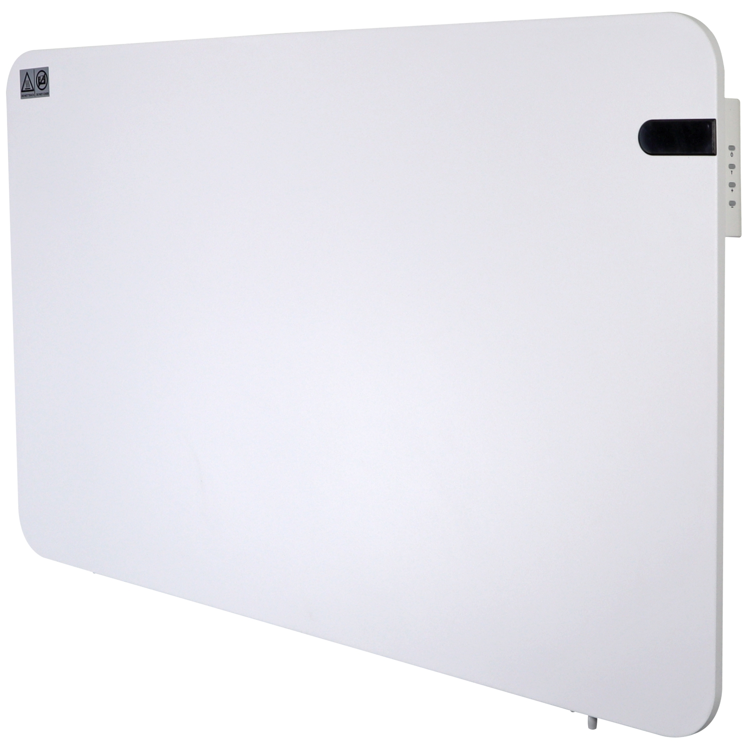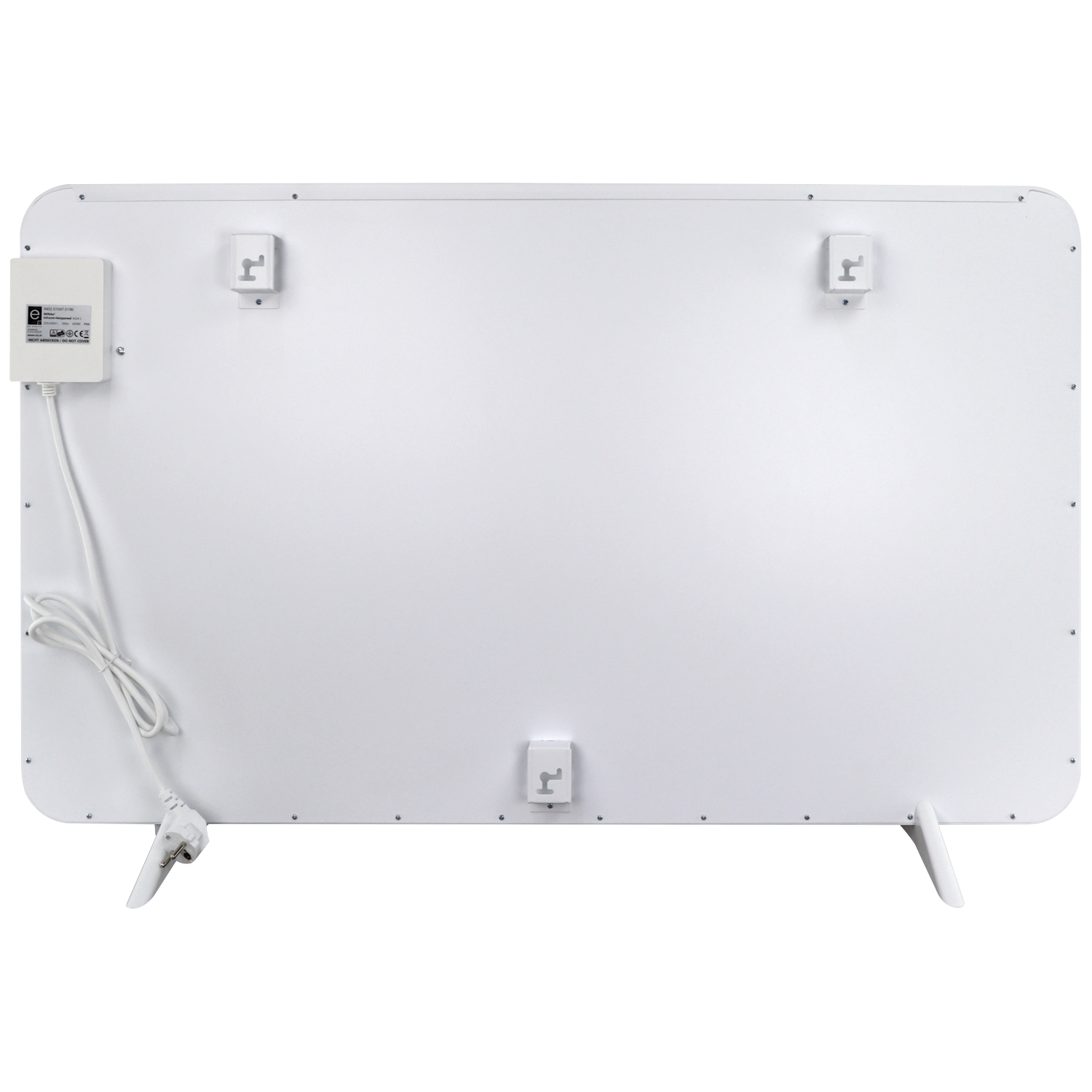 Infrarot-Heizpaneel mit integrierten Thermostat, inkl. Fernbedienung und Standfüße, für Räume von 8-12m² (unverbindlicher Orientierungswert: basierend auf Raumhöhe 2,50m und Dämmung nach heutigem Standard), mit Überhitzungsschutz, 1.9m Anschlussleitung mit Stecker, Anschluss 220-240V AC 50Hz, IP44, Lebensdauer: 100.000Std., Temperatureinstellbereich: 0°C bis +55°C, Timer: 0-24Std., Montage an Wand oder freistehend mittels Standfüße (inkl.); bei Montage mit Standfüßen ist das Heizpaneel gegen Kippen zu sichern;