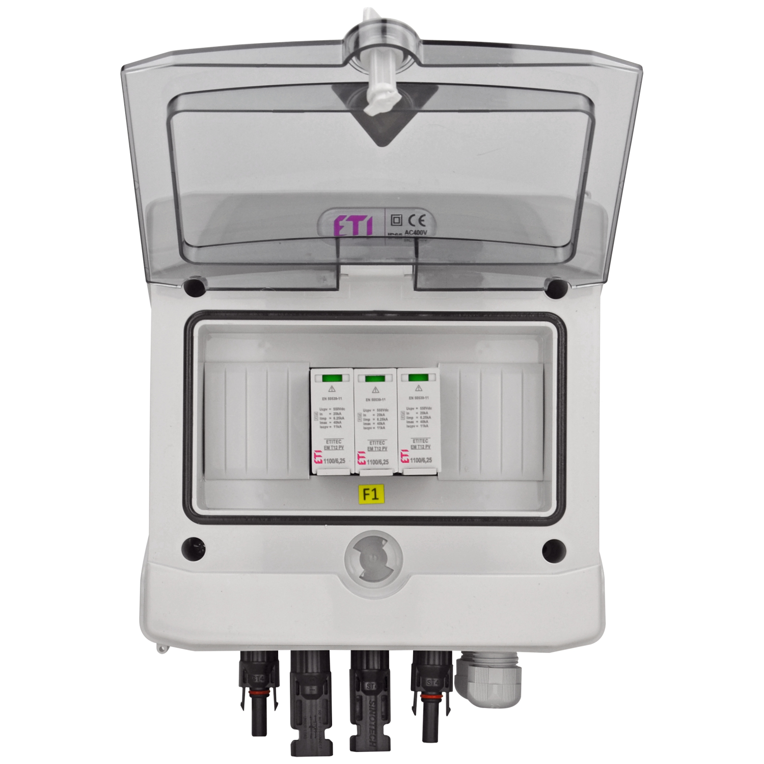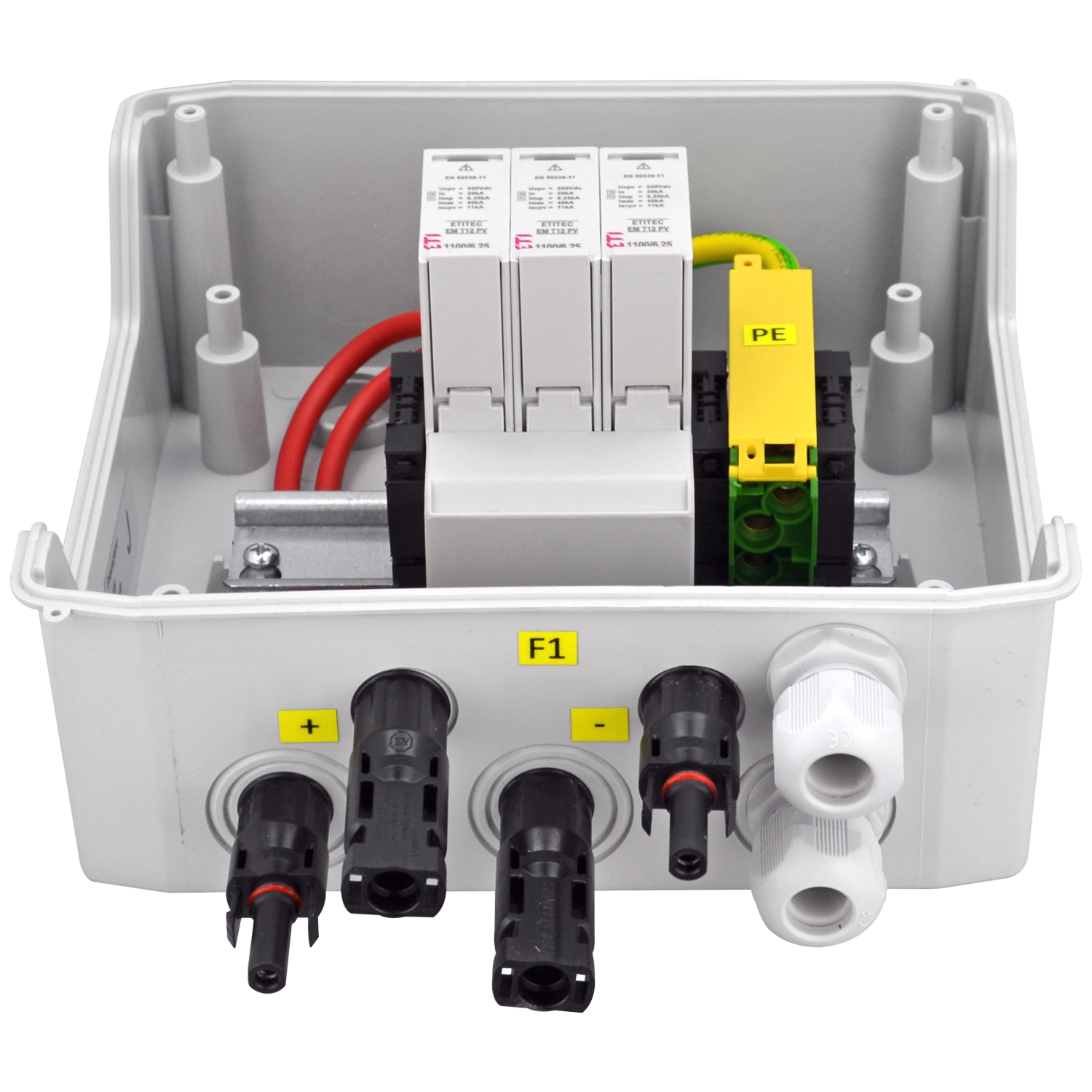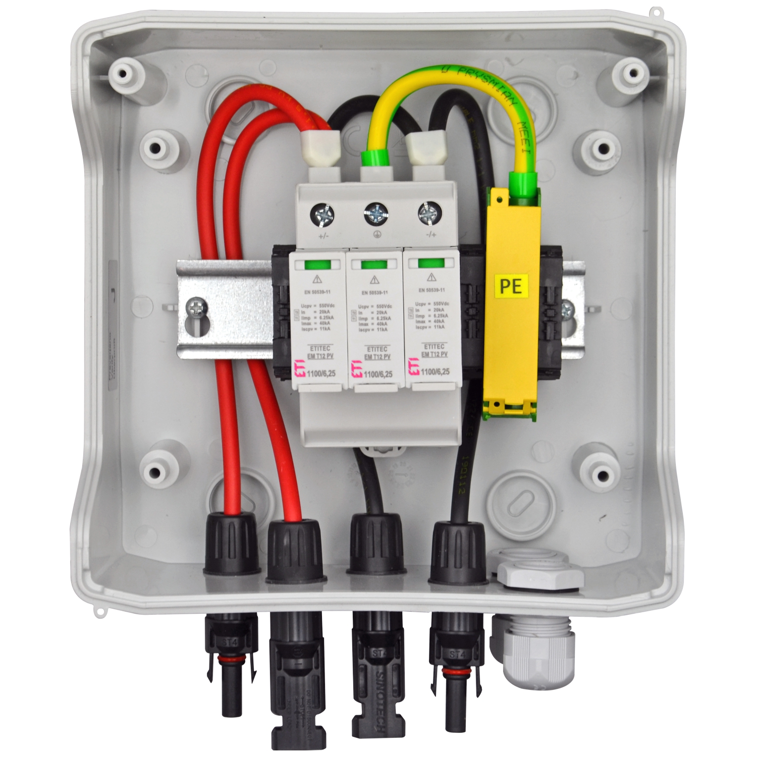 PV-Generatoranschlusskasten für 1-String - steckerfertig, 1x AP-Verteiler 8TE IP65, 1x Ü-Ableiter PV T1+T2 1100V DC, 2x Anbauverschraubung M20/PG13 für Erdungsanschluss, 2x Steckverbindung MC4 montiert (Buchse+Stecker), 2x MC4 Stecker+Buchse für PV-Seite beigelegt;