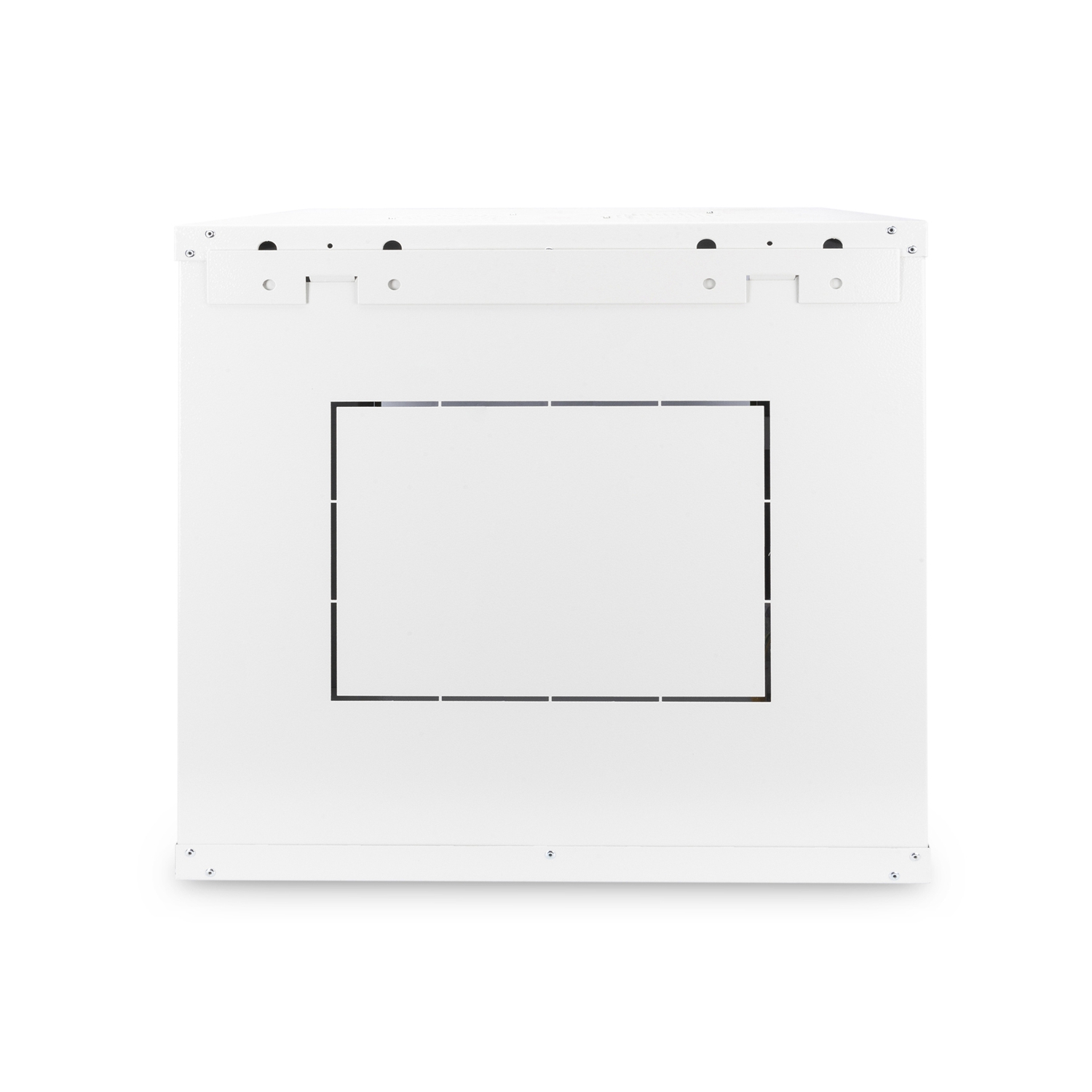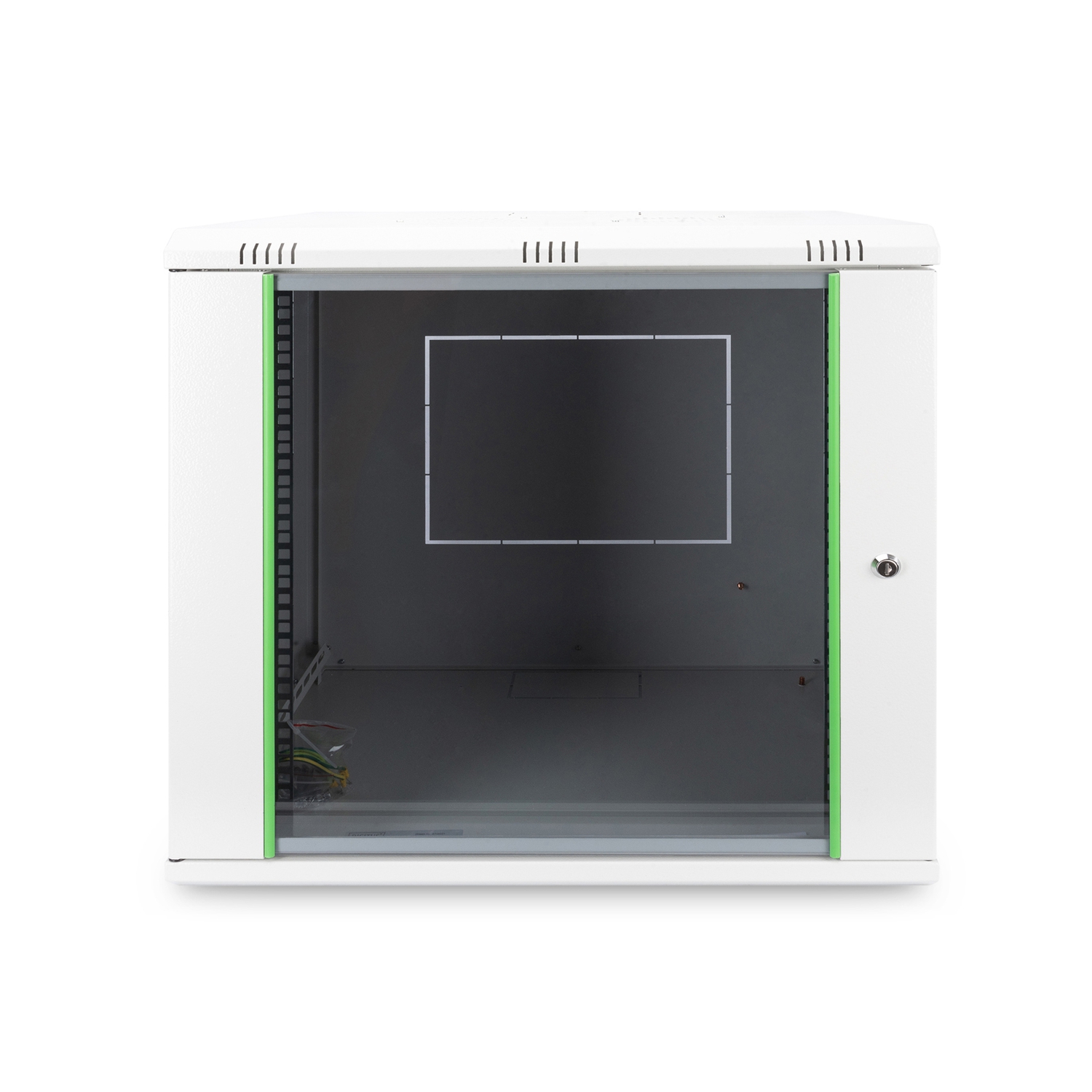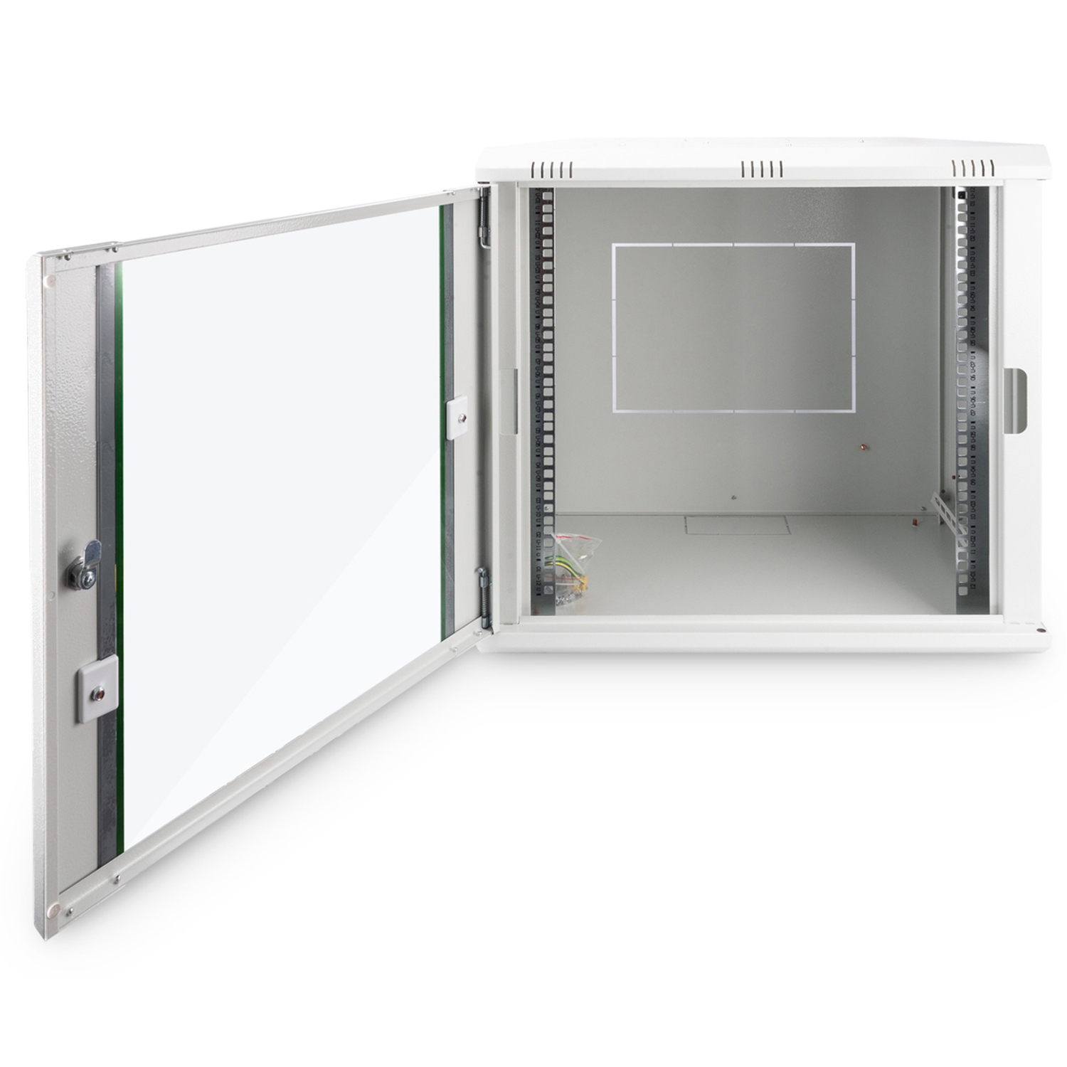 19" Wandgehäuse, Material: Stahlblech pulverbeschichtet, 483 mm (19") Profilschienen an der Vorder- und Rückseite tiefenvariabel, abschließbare Sicherheitsglastür, Kabelzuführung von oben, unten und hinten, Lüftungsschlitze für aktive sowie passive Be- und Entlüftung, Seitenteile abnehmbar, 4 Erdungspunkte (Boden, Seitenteil und Fronttür), Eigengewicht 20.0kg, IP20;