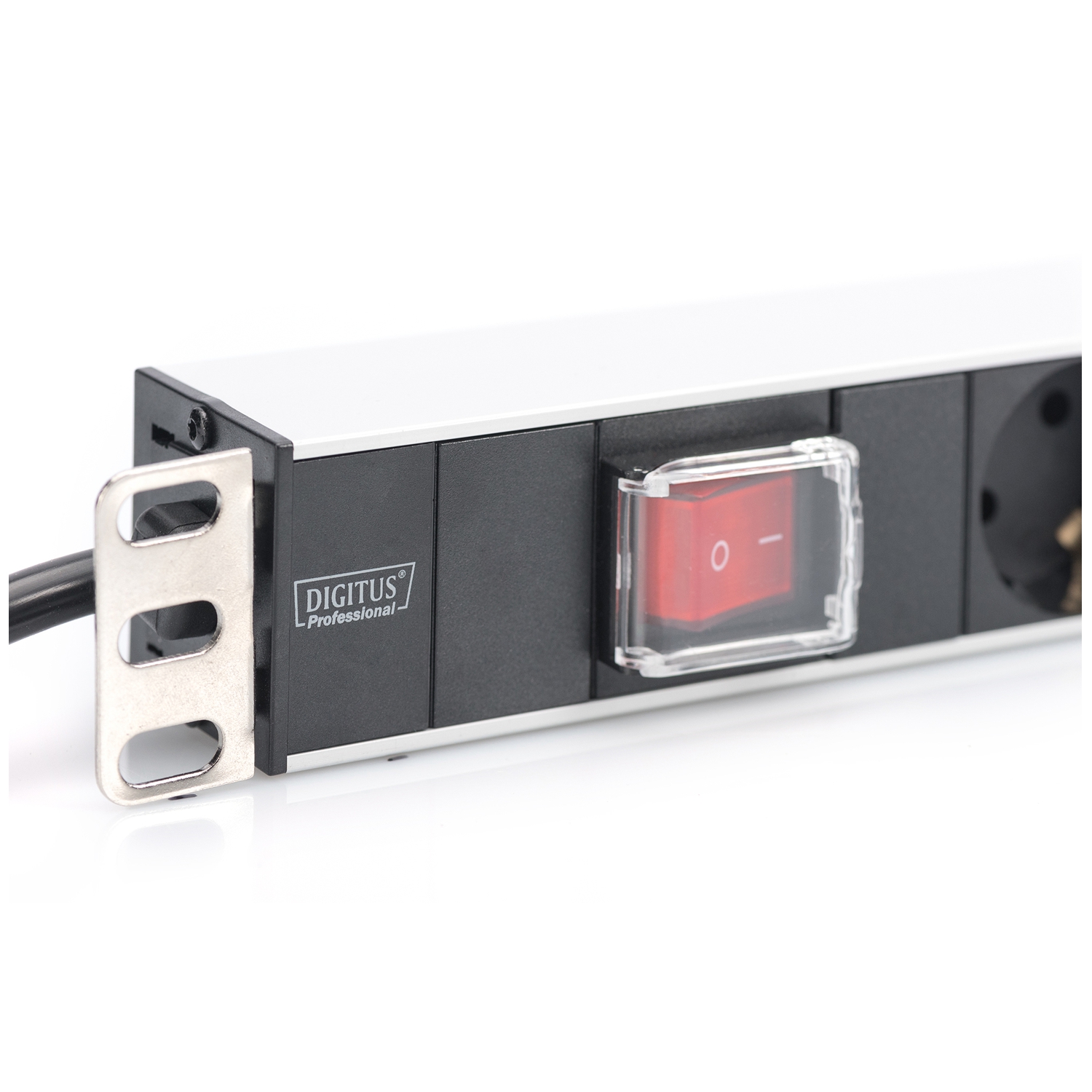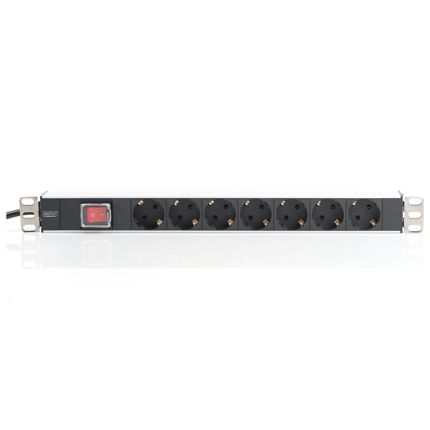 Steckdosenleiste mit 7 Steckplätzen (35° gedreht), mit beleuchtetem EIN/AUS Schalter, Anschlusskabel schwarz (3x1,5mm², 2 m) mit Winkelstecker, 250V AC / 16A / 4000W,Aluminiumprofil inkl. Montagehalterungen für 19" Einbau, Höhe: 1HE;